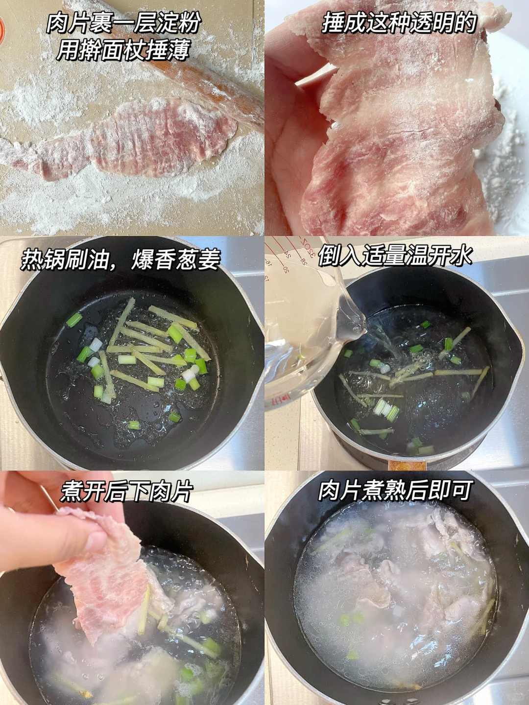 1️⃣里脊肉片用生姜腌制一会去腥,然后裹上一层淀粉,用擀面杖把肉片捶薄,越薄越好;