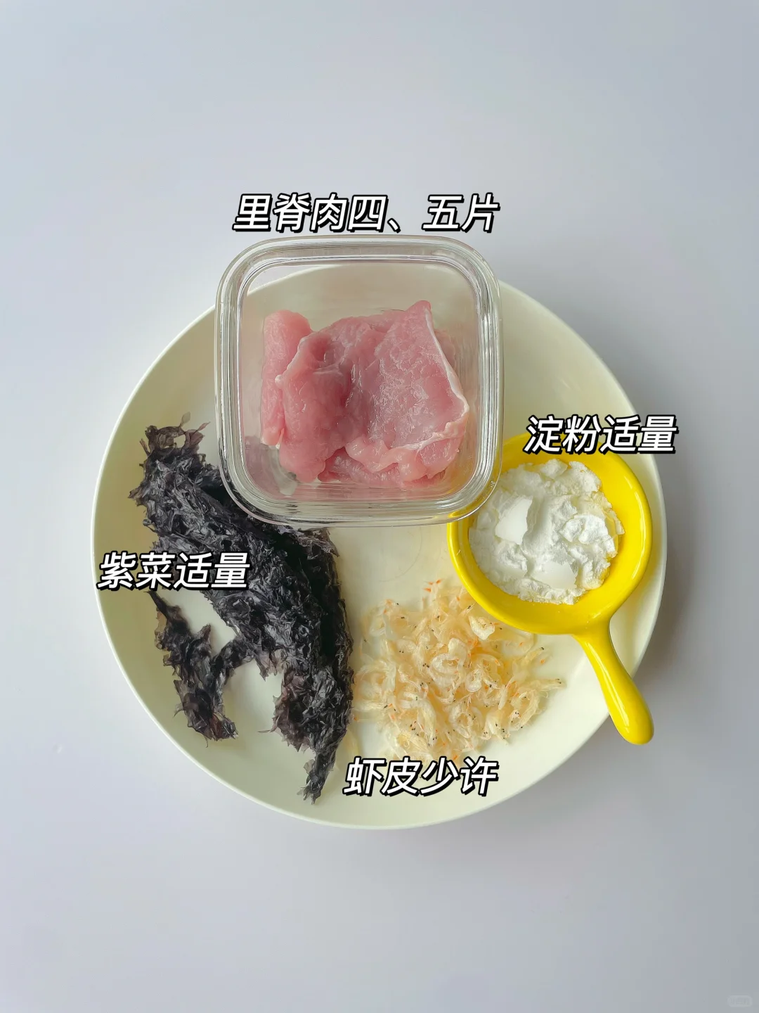1️⃣里脊肉片四、五片,紫菜、虾皮和淀粉适量;