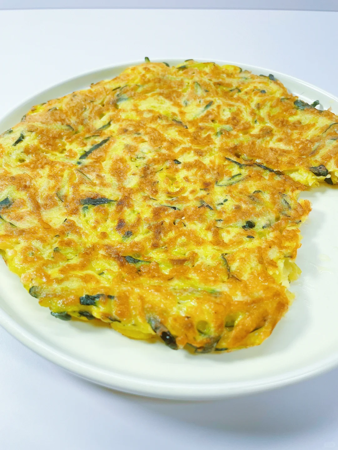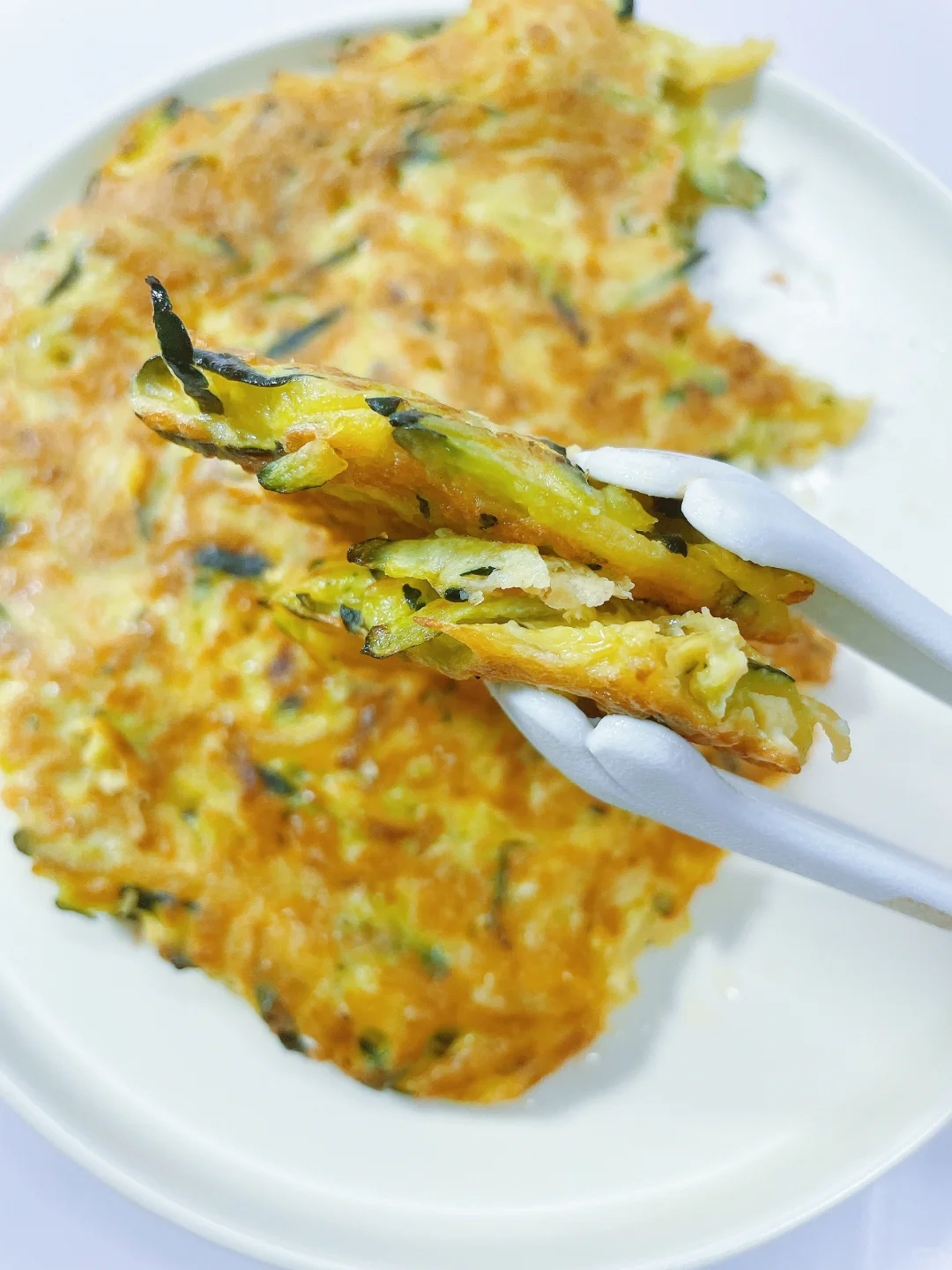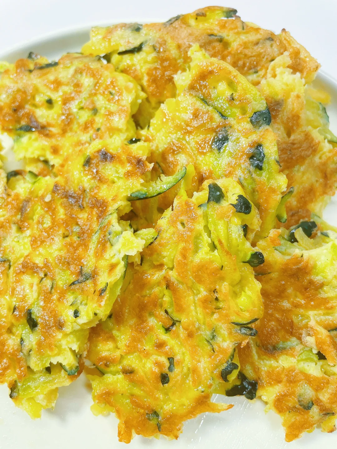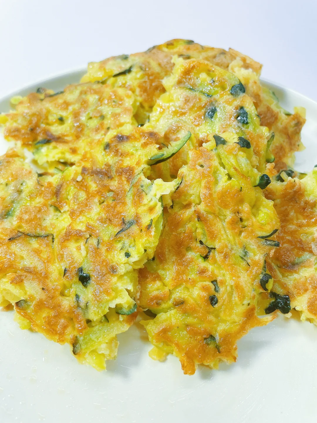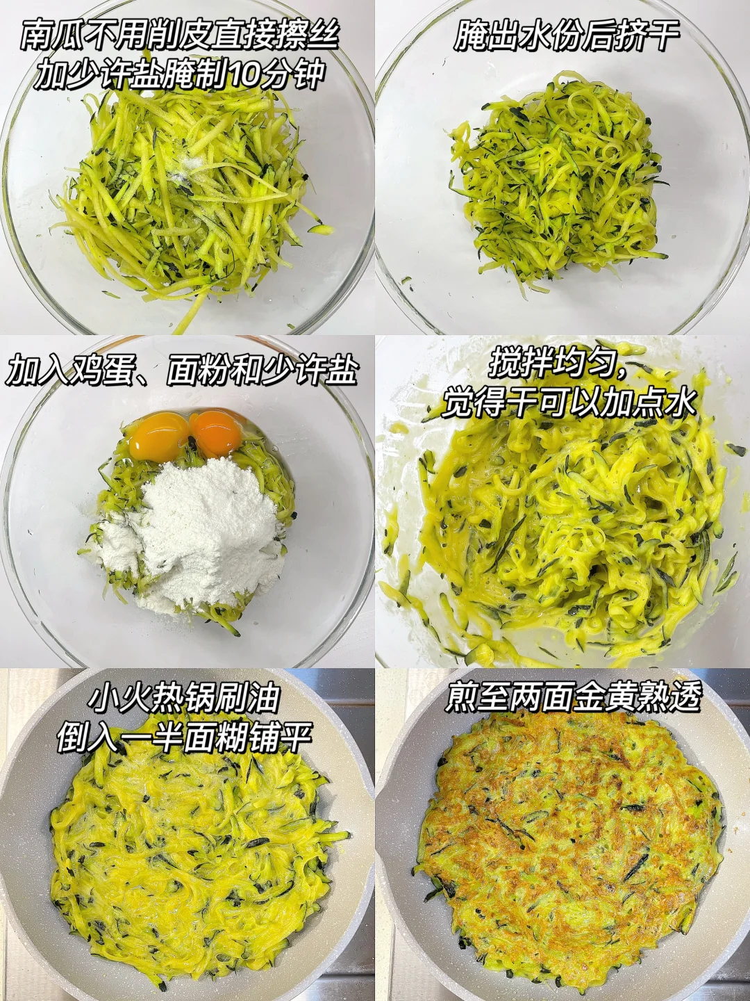 🌈香酥又清甜的南瓜丝煎饼~ 🎈准备食材: 1️⃣嫩南瓜一截,鸡蛋两个,面粉50克左右; 🎈制作步骤: 1️⃣南瓜不用削皮,直接擦丝,放入少许盐腌制10分钟,腌出水份后挤干; 2️⃣南瓜丝加入鸡蛋、面粉和少许盐,搅拌均匀,如果觉得干可以加点水; 3️⃣平底锅小火热锅刷油,倒入一半面糊,煎至两面金黄熟透即可~