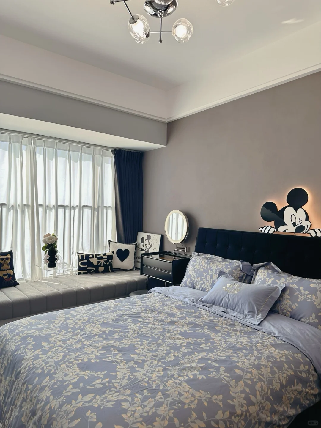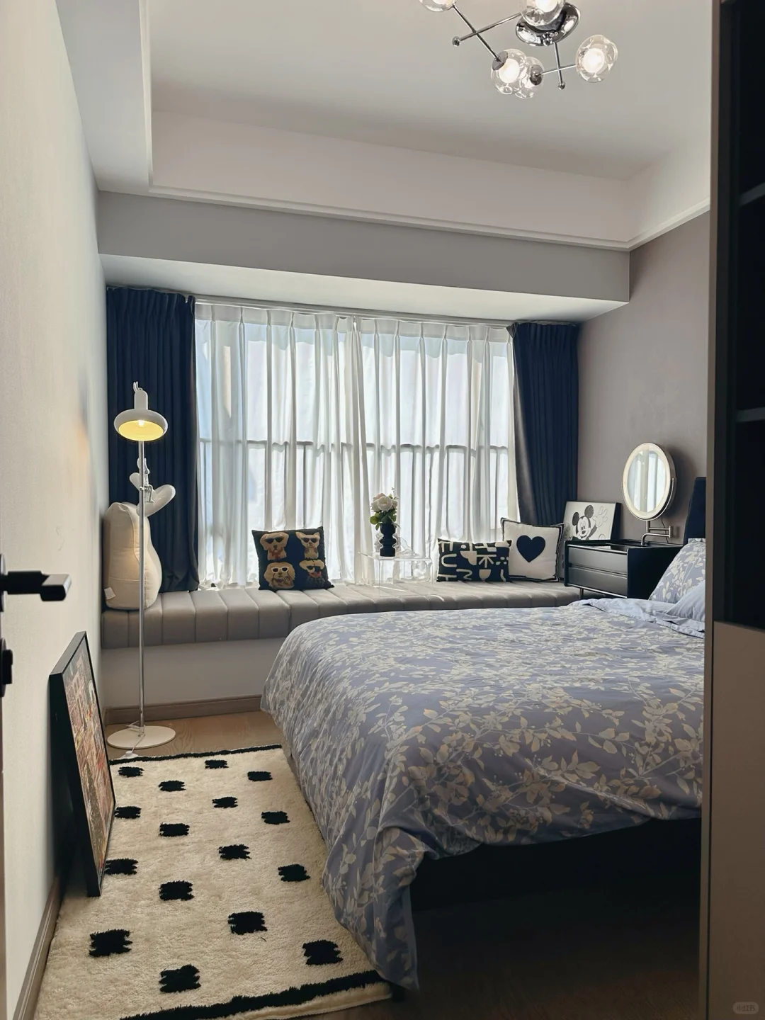 新家没有请设计装修团队,都是自己抄作业然后装修了一个自己喜欢的卧室,虽然面积不大,但是布置得满满当当的,很温馨很舒适太好宅了 🟤烟灰色的背景墙,黑色的双人床和梳妆台,高级感满满,铺上一块床边毯还有蓝色的床品,真的太舒服了 🟤衣柜设计分享 长1.7米,高2.45米,深度55厘米 上柜门高1.5米,下柜门高80厘米 柜门:奶咖色 柜体:深灰色 上长下短式的设计,无拉手无拉直器 极简又耐看! 奶咖灰卧室,简单温馨就好啦~