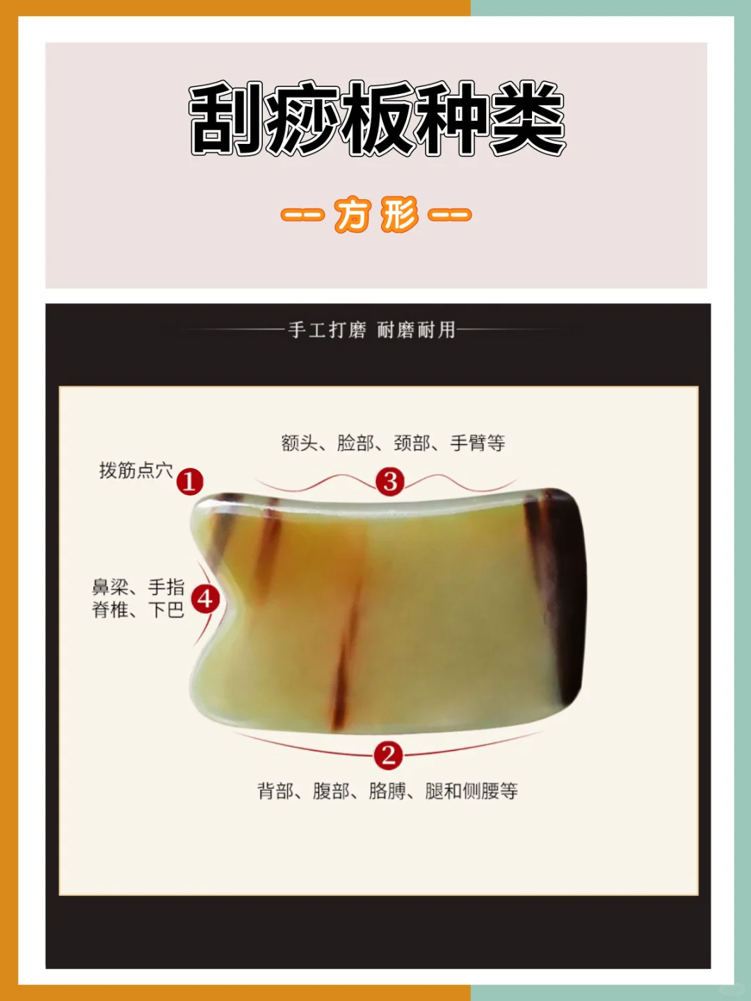 🌸方形:适用于背部、腹部、胸部、四肢,刮痧排毒疏通经络;