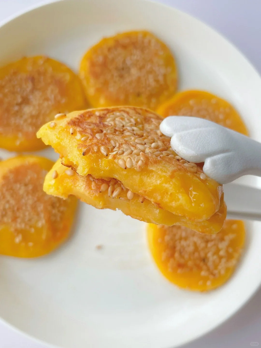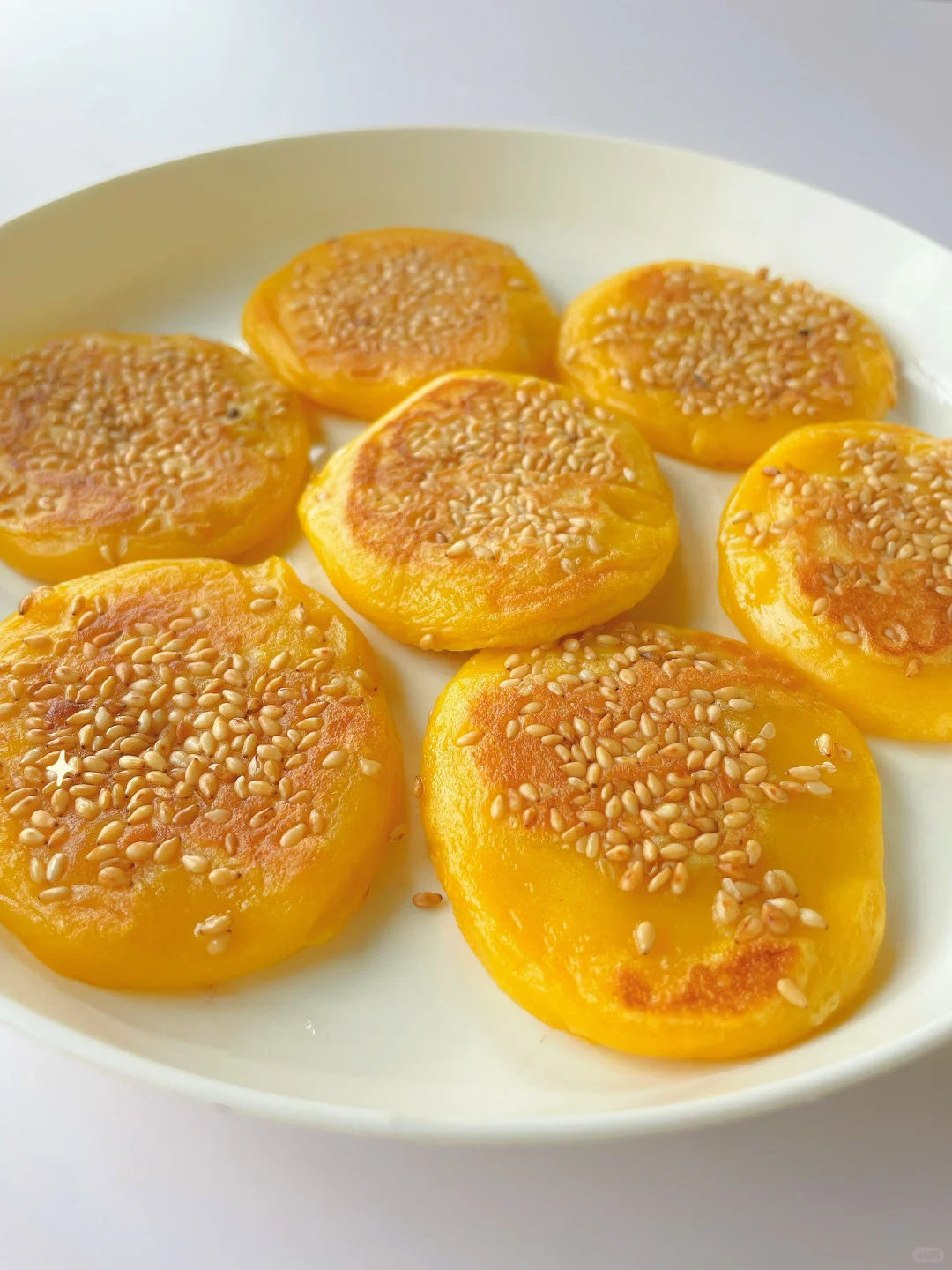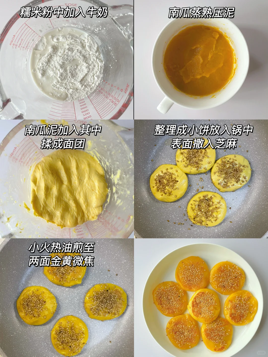 🌈香甜软糯的南瓜饼~ 🎈准备食材: 1️⃣南瓜泥150克,糯米粉140克,牛奶10克,白糖10克(可不加); 🎈制作步骤: 1️⃣南瓜蒸熟后倒掉多余水份,然后压泥,取150克备用; 2️⃣糯米粉中加牛奶,再倒入南瓜泥,先搅拌成絮状,再用手揉成面团,面团不成型可以再加点糯米粉; 3️⃣平底锅热锅刷油,然后关火,取20克左右一个面团,整理成小饼放入锅中,表面撒入芝麻后再开火 4️⃣小火煎至两面金黄微焦熟透即可~