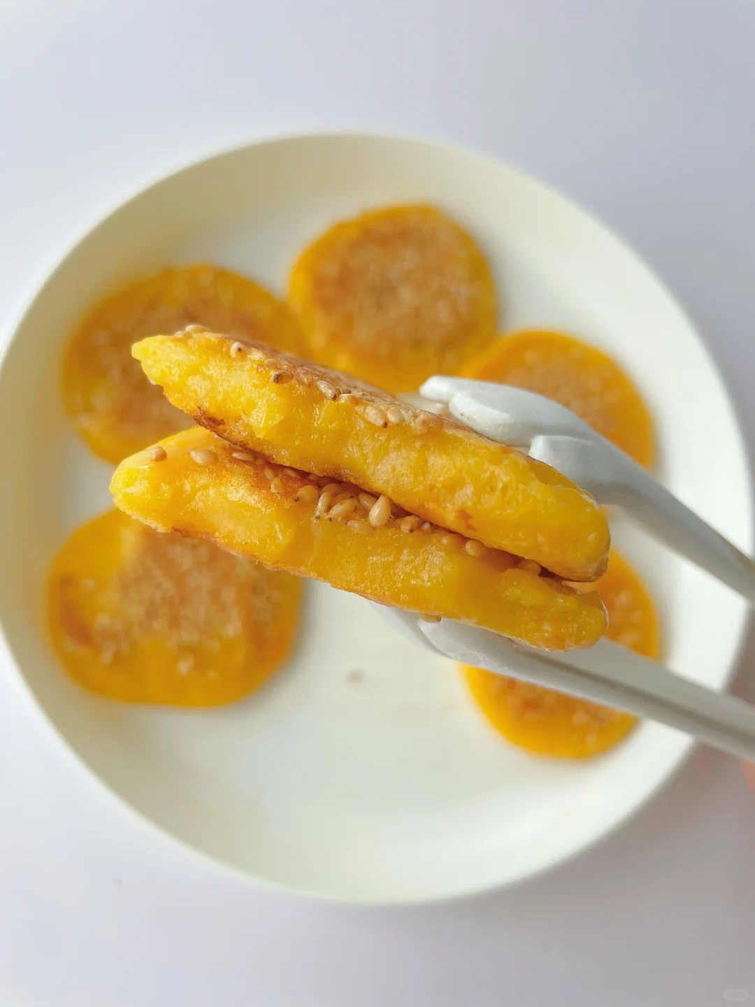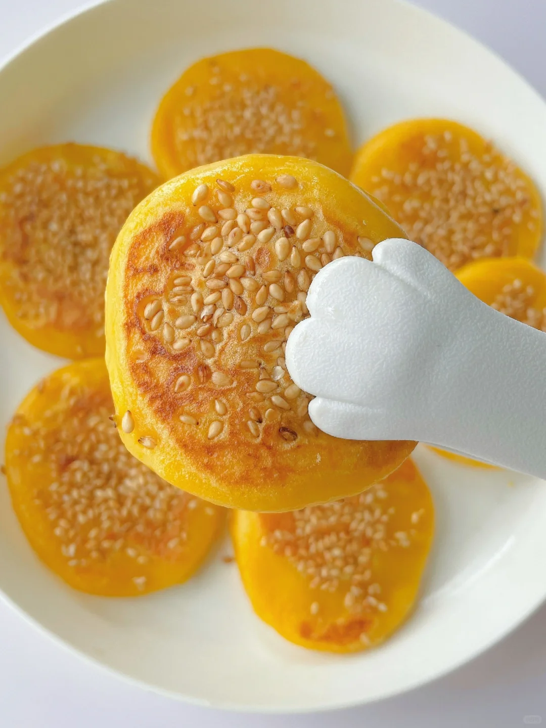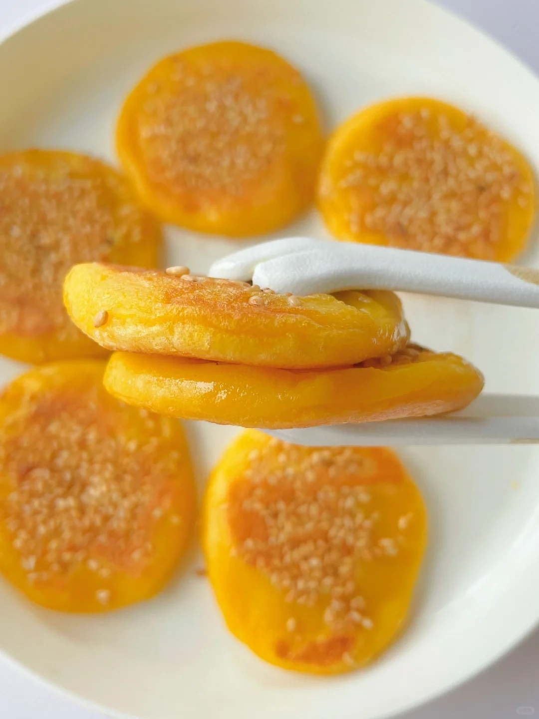 🌈香甜软糯的南瓜饼~ 🎈准备食材: 1️⃣南瓜泥150克,糯米粉140克,牛奶10克,白糖10克(可不加); 🎈制作步骤: 1️⃣南瓜蒸熟后倒掉多余水份,然后压泥,取150克备用; 2️⃣糯米粉中加牛奶,再倒入南瓜泥,先搅拌成絮状,再用手揉成面团,面团不成型可以再加点糯米粉; 3️⃣平底锅热锅刷油,然后关火,取20克左右一个面团,整理成小饼放入锅中,表面撒入芝麻后再开火 4️⃣小火煎至两面金黄微焦熟透即可~