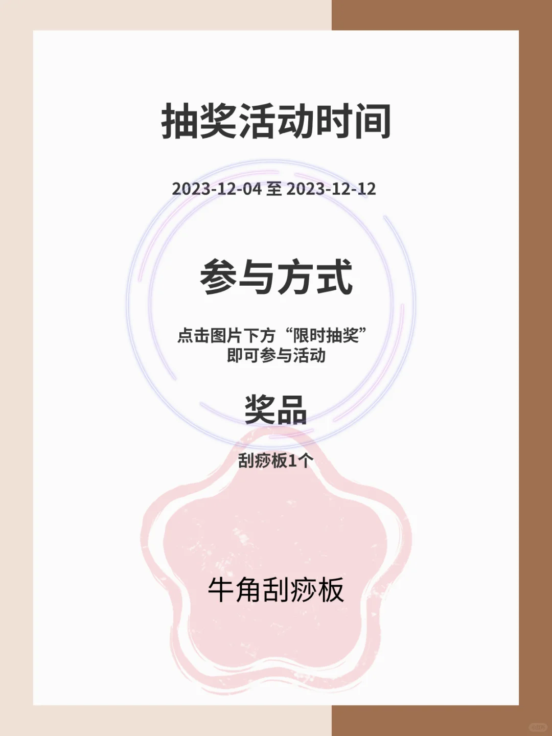 给粉丝送福利 牛角刮痧板0元领取, 抽奖获得 ✅适用于:面部、肩颈、四肢、背部等; ✅天然牛角制作,手工打磨 ✅圆润光滑厚实 水牛角味辛、咸、寒。 辛可发散行 气、活 血润养; 咸能软坚润下; 寒能清热 解 毒 👉抽奖时间:2023-12-04 00:00:00至2023-12-12 00:00:00 👉开奖时间:2023-12-12 15:00:00 👉奖品:牛角刮痧板,厚0.7cm左右 👉奖品数量:1份 👉参与方式:图片左下,限时抽奖 🔺抽奖规则 系统随机抽取,随机抽取1名幸运参与者 ⚠️温馨提示 ❗️中奖者需7天内提交收件地址,逾期未填写,中奖资格作废。