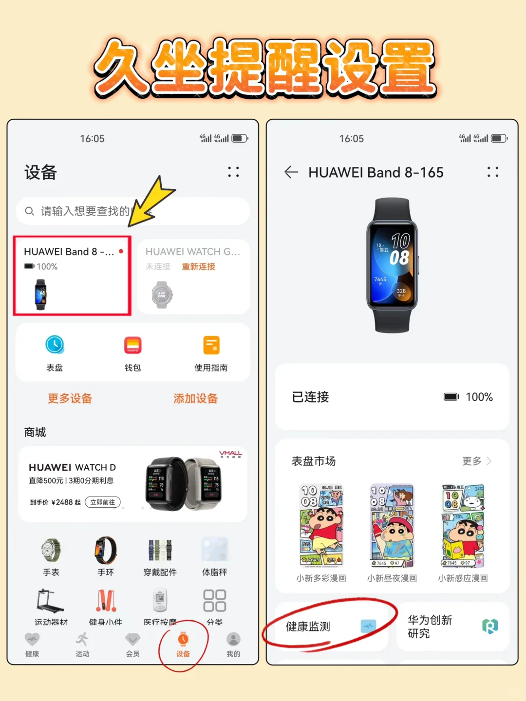 华为运动健康App首页(设备页面)> 上方设备卡片进入详情页 > 健康监测 > 打开/关闭久坐提醒