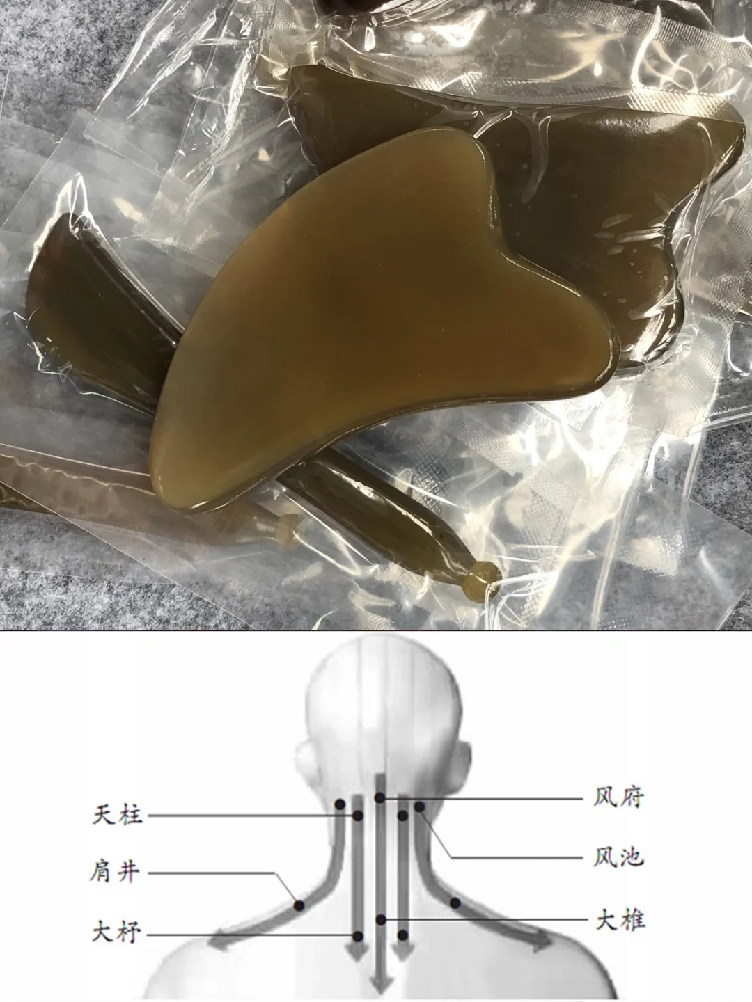 刮痧板是刮痧的主要器具,常用的刮痧板有心形/v形、方形、半圆形、鱼形、肾形、椭圆形等。刮痧板一般选择砭石与天然水牛角做原料,通过刺激人体的相关经络、穴位,从而达到康健养生的效果。