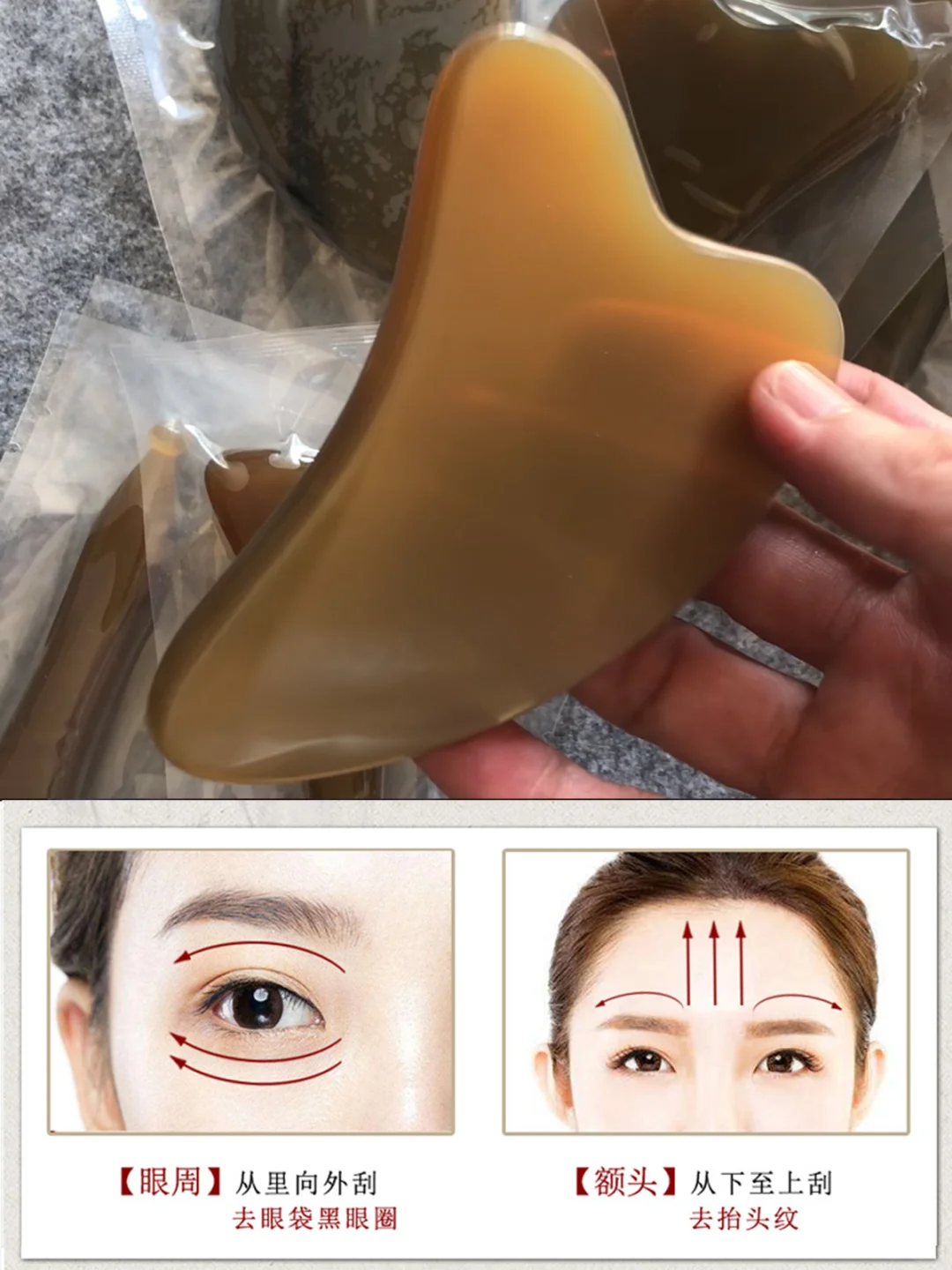 ⚠️注意:自己动手刮痧要注意,刮痧的手法要轻柔,以脸部肌肉稍有感觉的力道即可。脸部刮痧前一定要先擦保养品,帮助刮痧板轻松滑动,才能避免拉扯出细纹或者刮伤脸部肌肤。