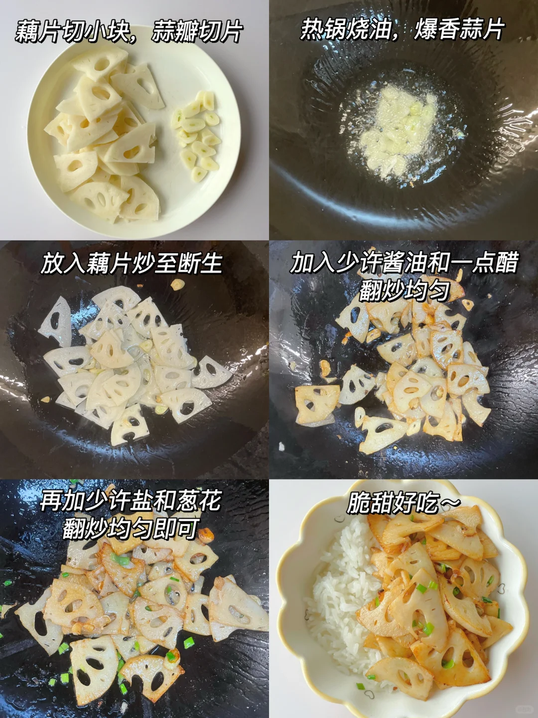 🌈跟大家分享我家宝宝特别爱的一道菜,简简单单的素炒藕片~脆甜又下饭! 🎈准备食材: 1️⃣莲藕小半截,大蒜两颗; 🎈制作步骤: 1️⃣藕片切小块,大蒜切片; 2️⃣热锅烧油,放入蒜片爆香,倒入藕片炒至断生,再倒入少许酱油和一点醋翻炒均匀; 3️⃣最后加入少许盐和葱花即可出锅(不爱葱花的小朋友可以不加)~