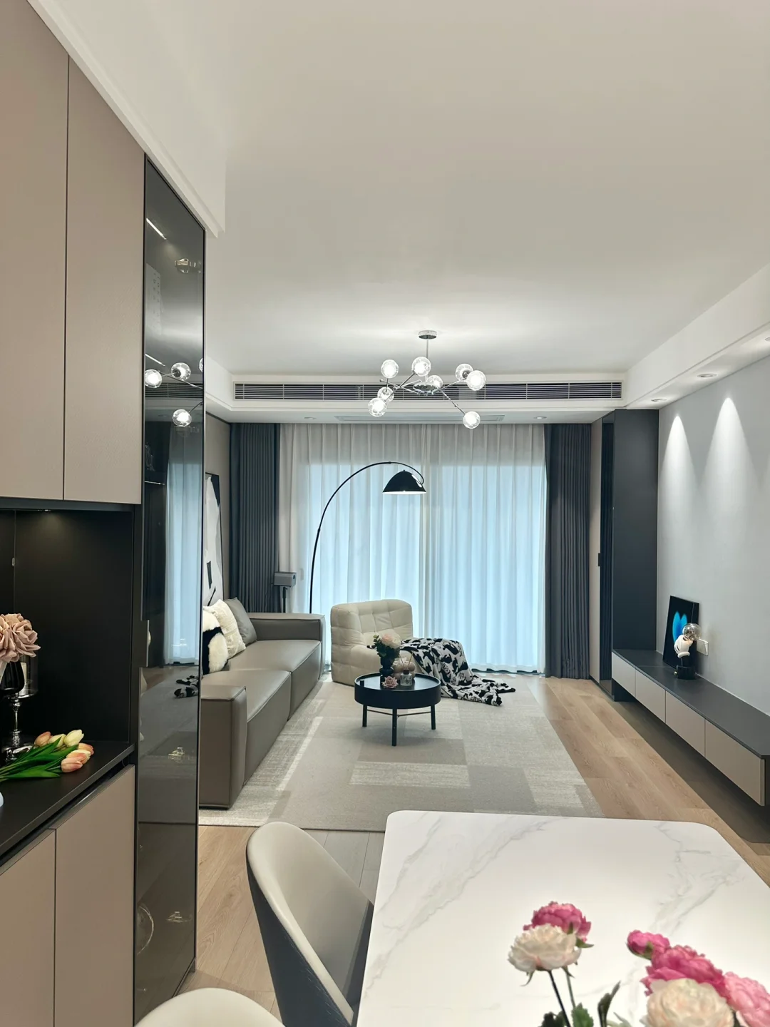 普通家庭,一家三口👨👩👦 跟老公一起努力 有了属于我们的小家 四室两厅两卫,装修简简单单的 奶咖色的背景墙,卡其灰色的沙发 L型悬空电视柜、满墙餐边柜 时尚又百搭的餐桌 温馨又舒服的家真的越住越爱~ 祝姐妹们👭也早日拥有自己的Dream house!