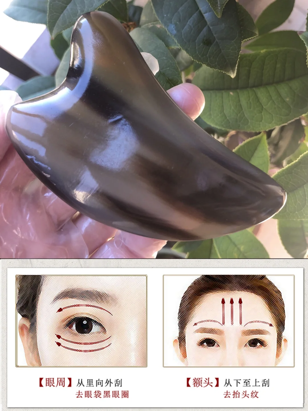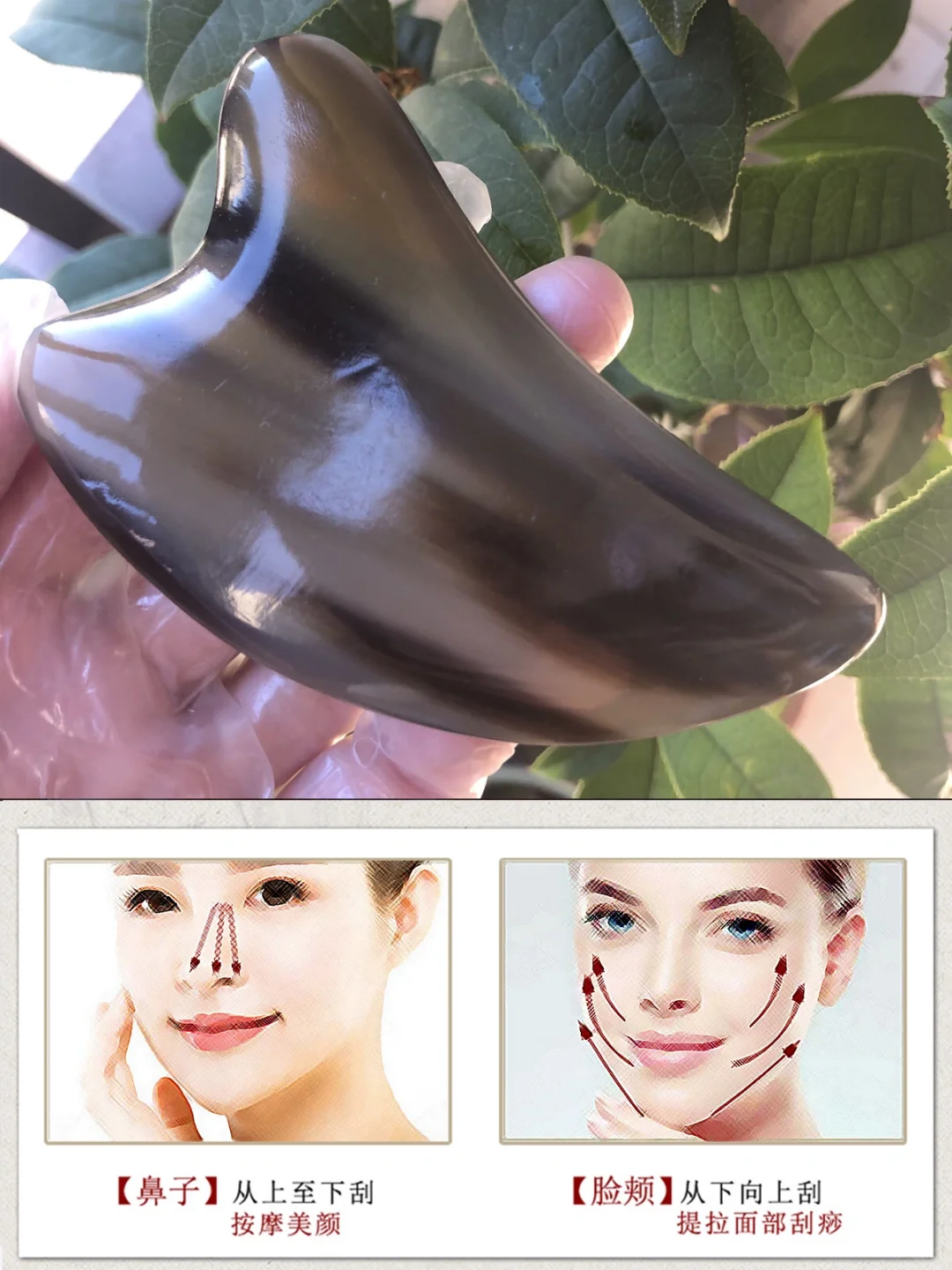 经络不通带来的面部问题 🌸督脉 肩颈酸痛,腰膝酸软。毛孔粗大,皮肤松弛,无弹性。 🌸膀胱经 尿频,尿急。面部浮肿,眼袋加深。 🌸胆经 脾气躁动,偏头 痛。眼角色斑,额角青筋。 🌸肝经 眼干眼涩,入睡困难。面色暗黄,长斑长痘。 🌸三焦经 头晕耳鸣,手脚寒冷。皮肤易过敏,神情萎靡 🌸小肠经 心慌心悸,过胖过瘦。眉心长斑,双目无神。 🌸任脉 主一身之血,贫血虚弱,月经不调。面色暗淡无光,长色斑。 🌸大肠经 便 秘,口臭。毛发干枯,皮肤粗糙。 🌸胃经 消化不良,肌肉松弛,无光泽,眼袋突出 - 面部拨筋的原则 先左后右,左行 气右行血,气为血之帅、血为气之母,只有气通畅了才能推动血的运行。 - 刮痧拨筋步骤 1、人中-->承浆-->下巴-->耳垂-->耳前沿发际线到神庭-->眉心。 2、承浆-->下巴-->耳垂后-->锁骨下淋巴穴。 3、承浆-->地仓(嘴角)。 4、人中-->地仓(嘴角)3/4交叉做 5、嘴角-->颊车穴-->耳垂后-->锁骨下淋巴穴。 6、鼻翼上下拉动 7、从下眼窝-->内外切割法令纹 8、鼻翼-->耳中-->耳垂后-->锁骨下淋巴穴。 9、上下拨动上眼窝 10、下眼窝-->承泣-->太阳穴-->水平拨动至发际线 从眉头-->眉尾-->太阳穴-->水平拨动至发际线 交叉做 11、从瞳子膠开始8字型拨动至发际线内 12、从眉头竖向至发际线-->太阳穴先竖后横呈田字拨动2遍 13、排 毒 14、提升瘦脸 15、脸部塑型 . 牛角刮痧板,牛角拨筋棒,中福康刮痧板,按摩梳子,经络梳; ⭕天然角板,任何2个板都不会一样; ⭕刮痧板+拨筋棒,美容焕肤好搭档; ⭕粉我,发信息❗