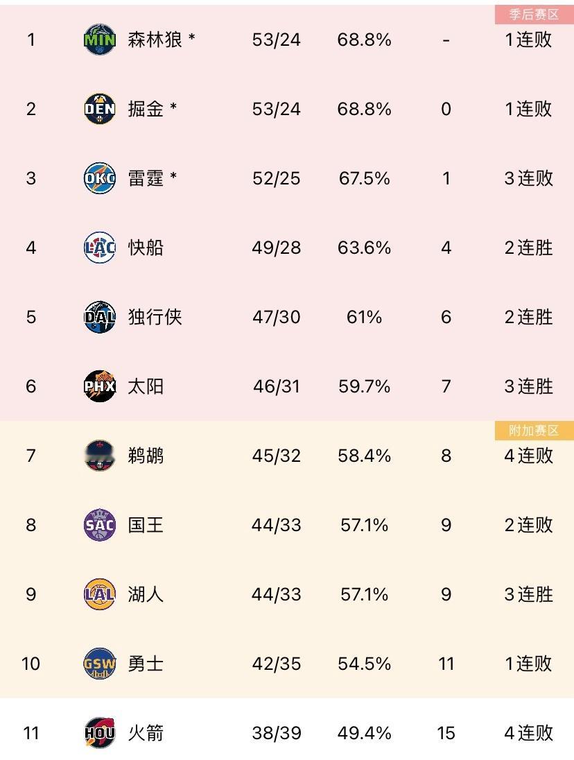快船过去6场比赛赢下5场,目前领先第五的独行侠2个胜场!