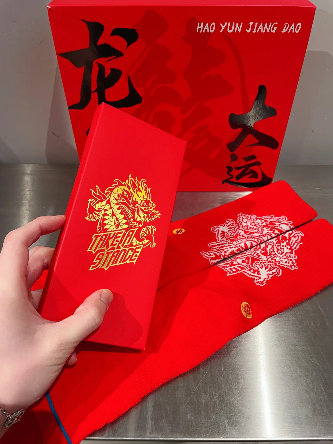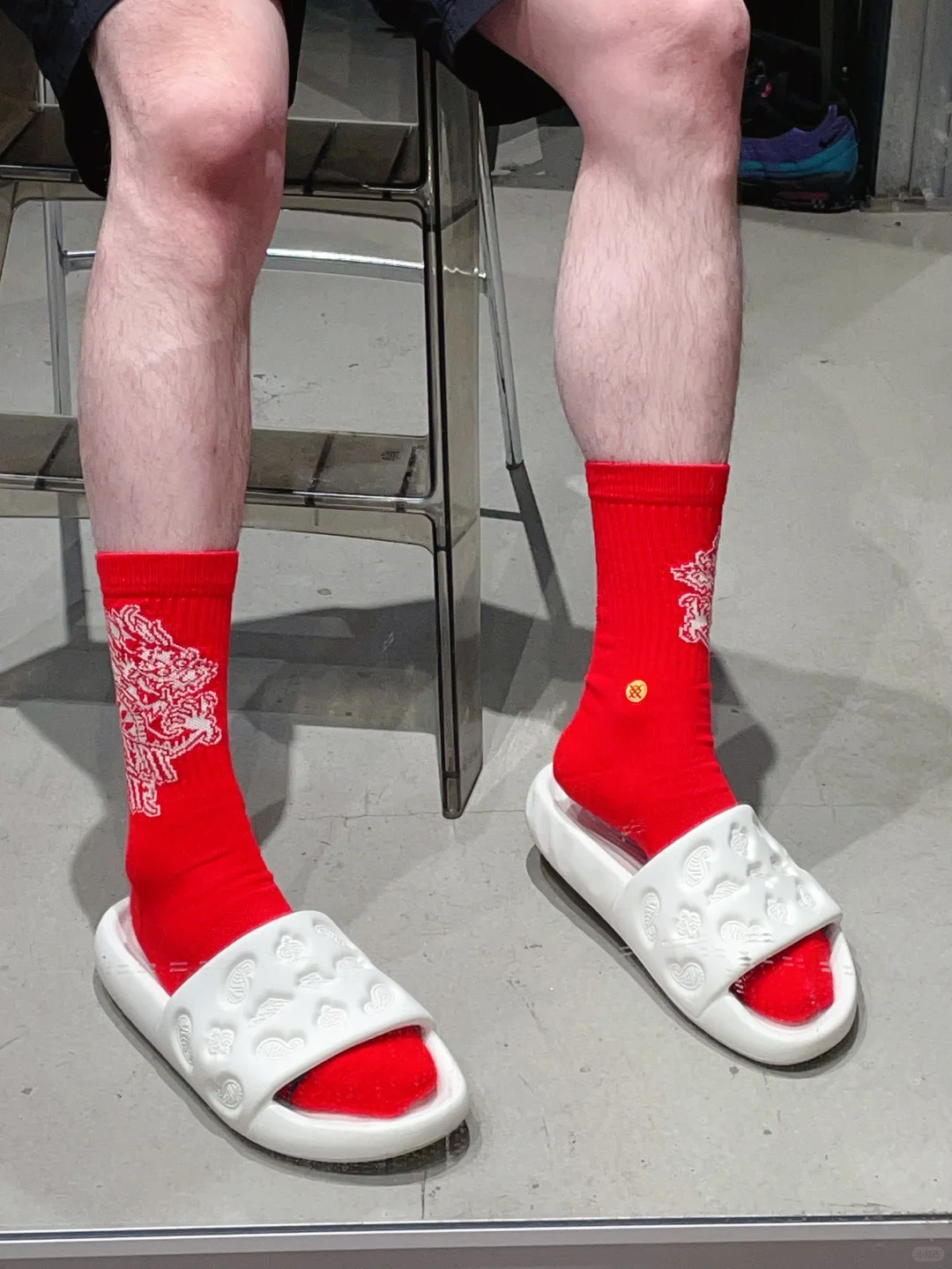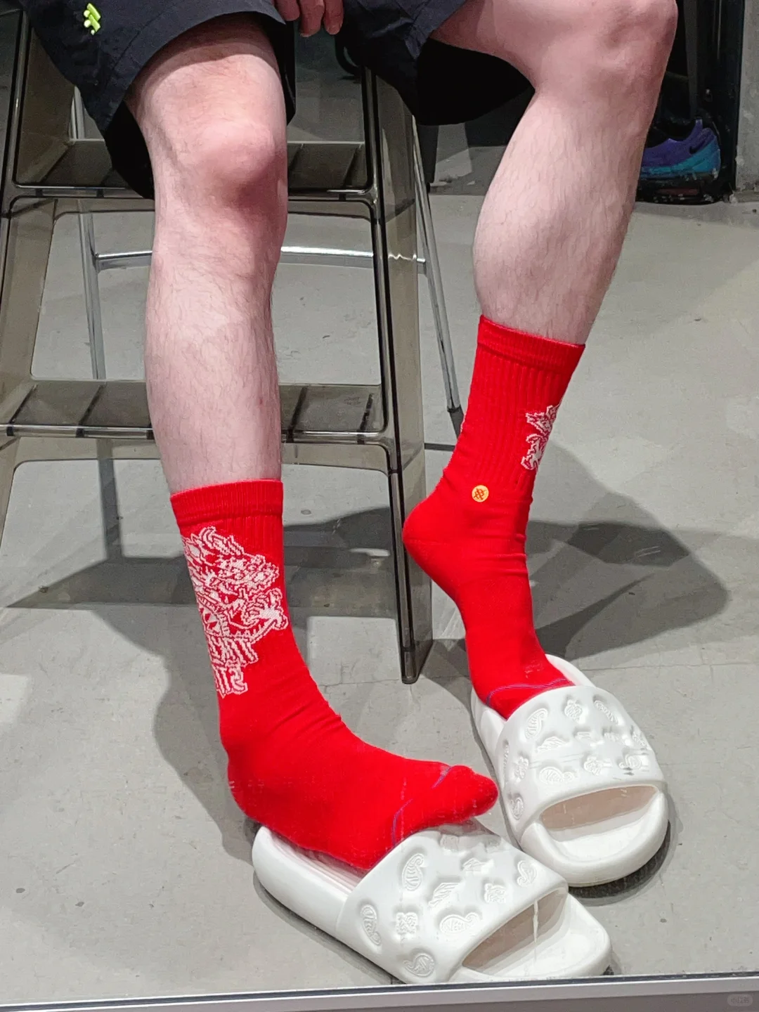新年到从头到脚都要红红火火 袜子也要龙年限定款🧦正红配色新年好寓意! 龙形🐲针织图案上脚十分帅气,金色logo标志很细节! 新年搭配必备红红火火,从头帅到脚!