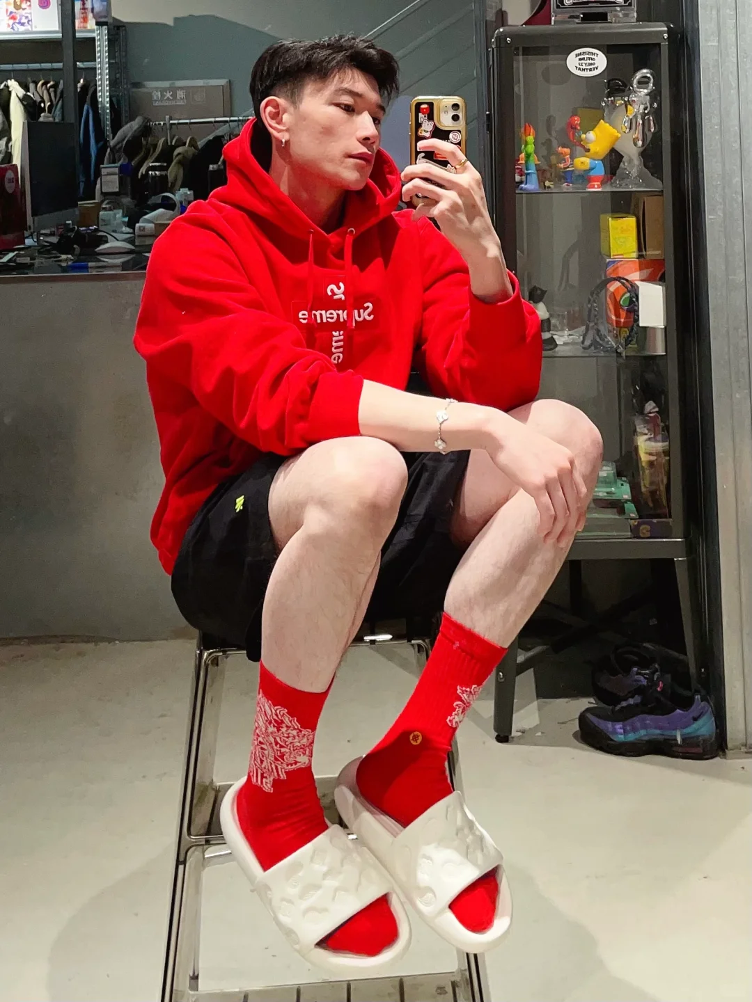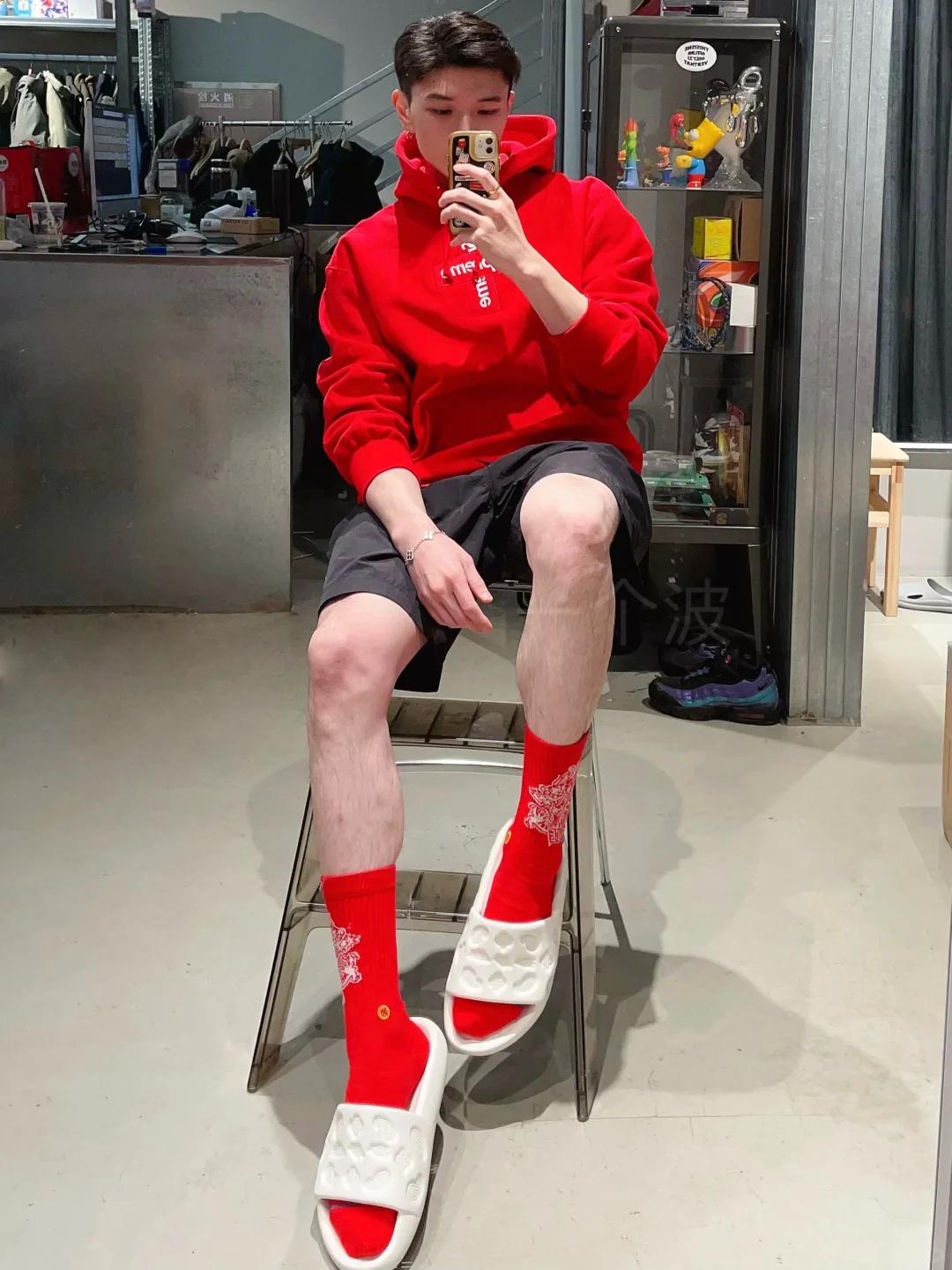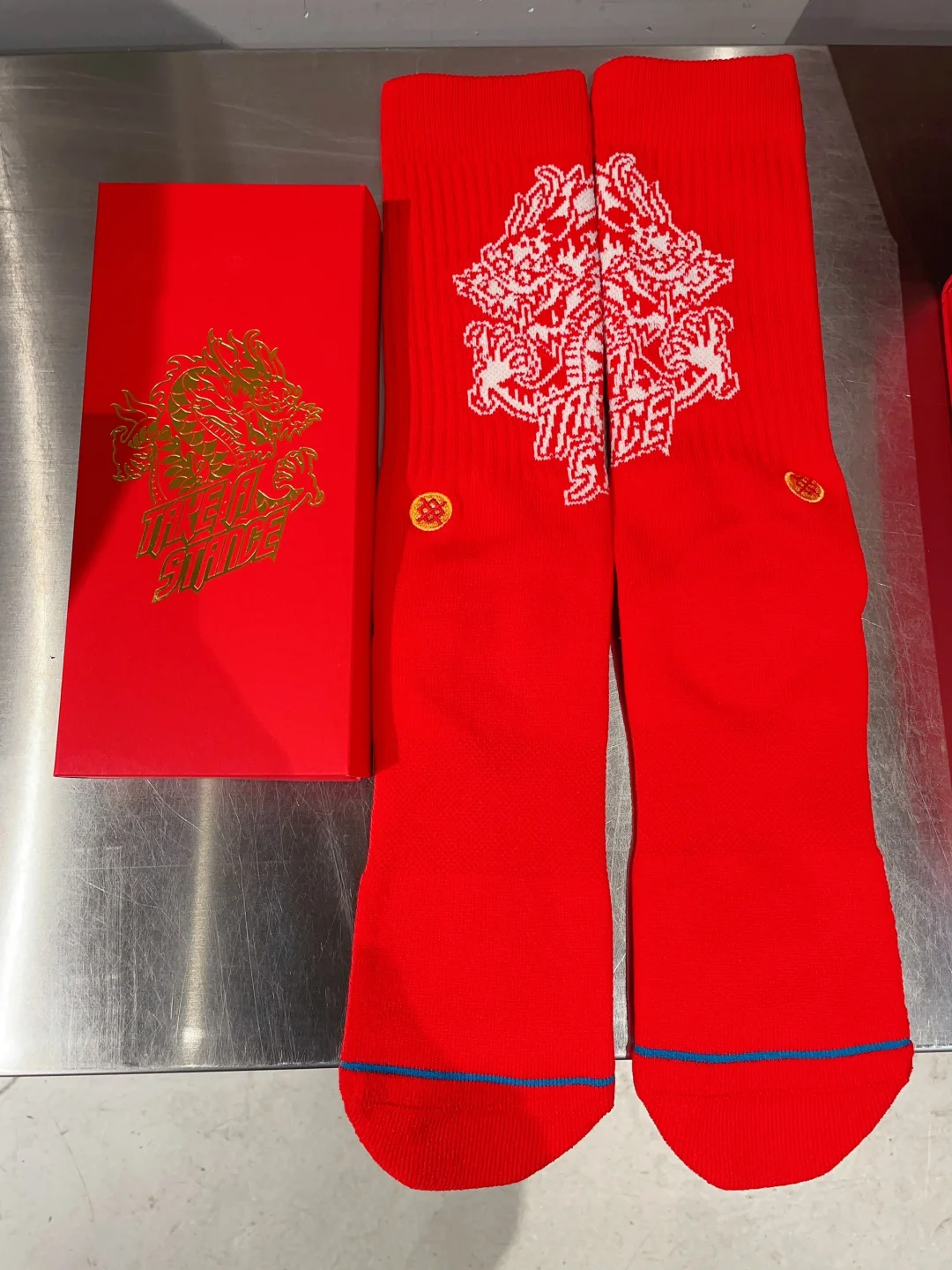 新年到从头到脚都要红红火火 袜子也要龙年限定款🧦正红配色新年好寓意! 龙形🐲针织图案上脚十分帅气,金色logo标志很细节! 新年搭配必备红红火火,从头帅到脚!