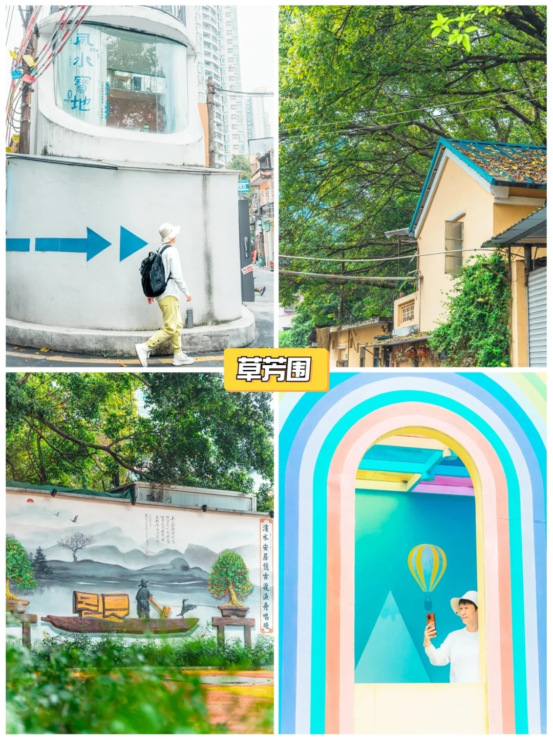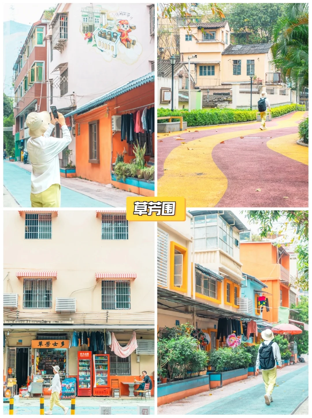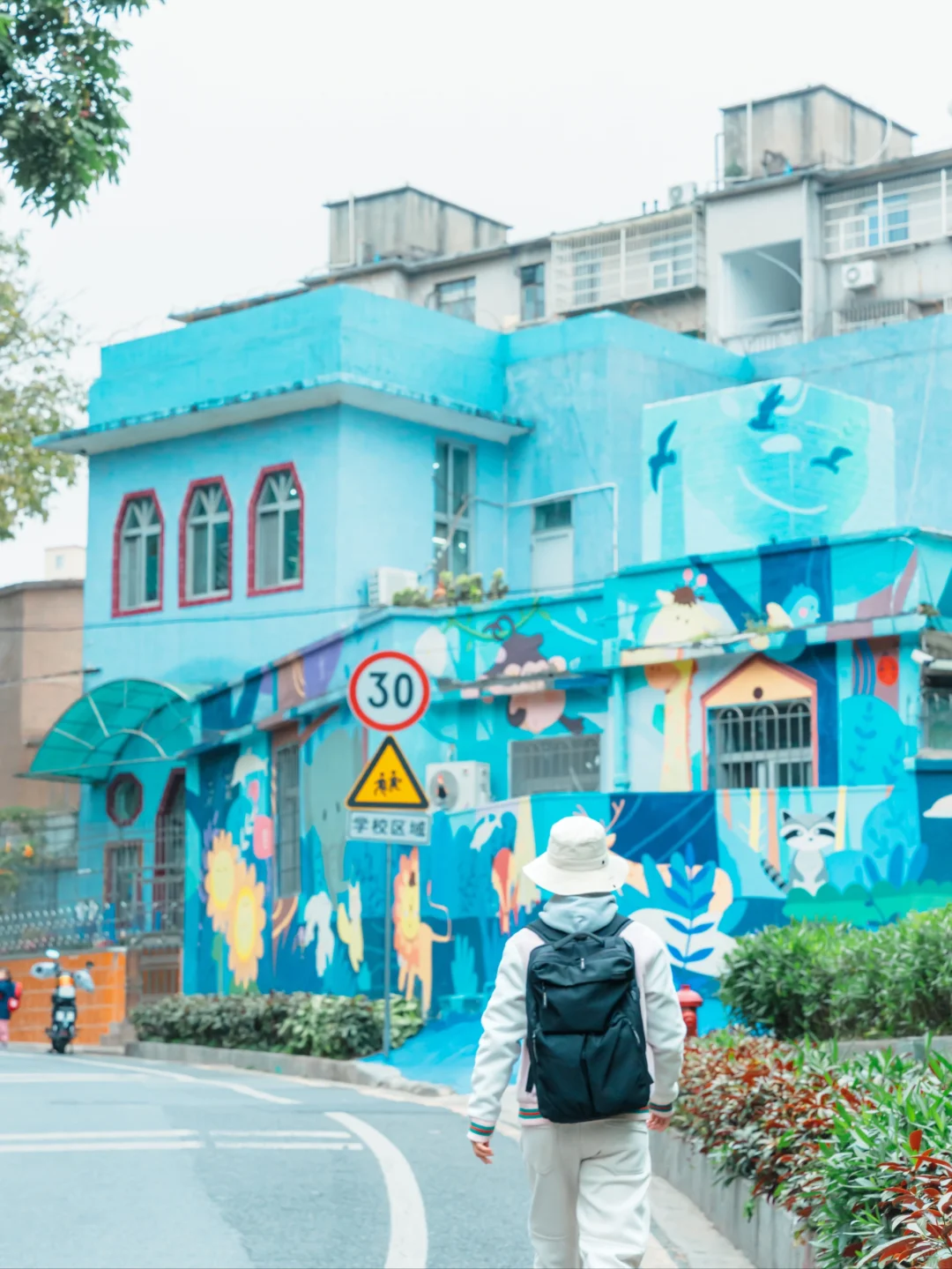 这里的老房子外墙涂上了多巴胺色彩,地面也铺上了“彩虹”通道,还有粤语涂鸦墙,仿佛一下子掉进了宫崎骏的漫画里