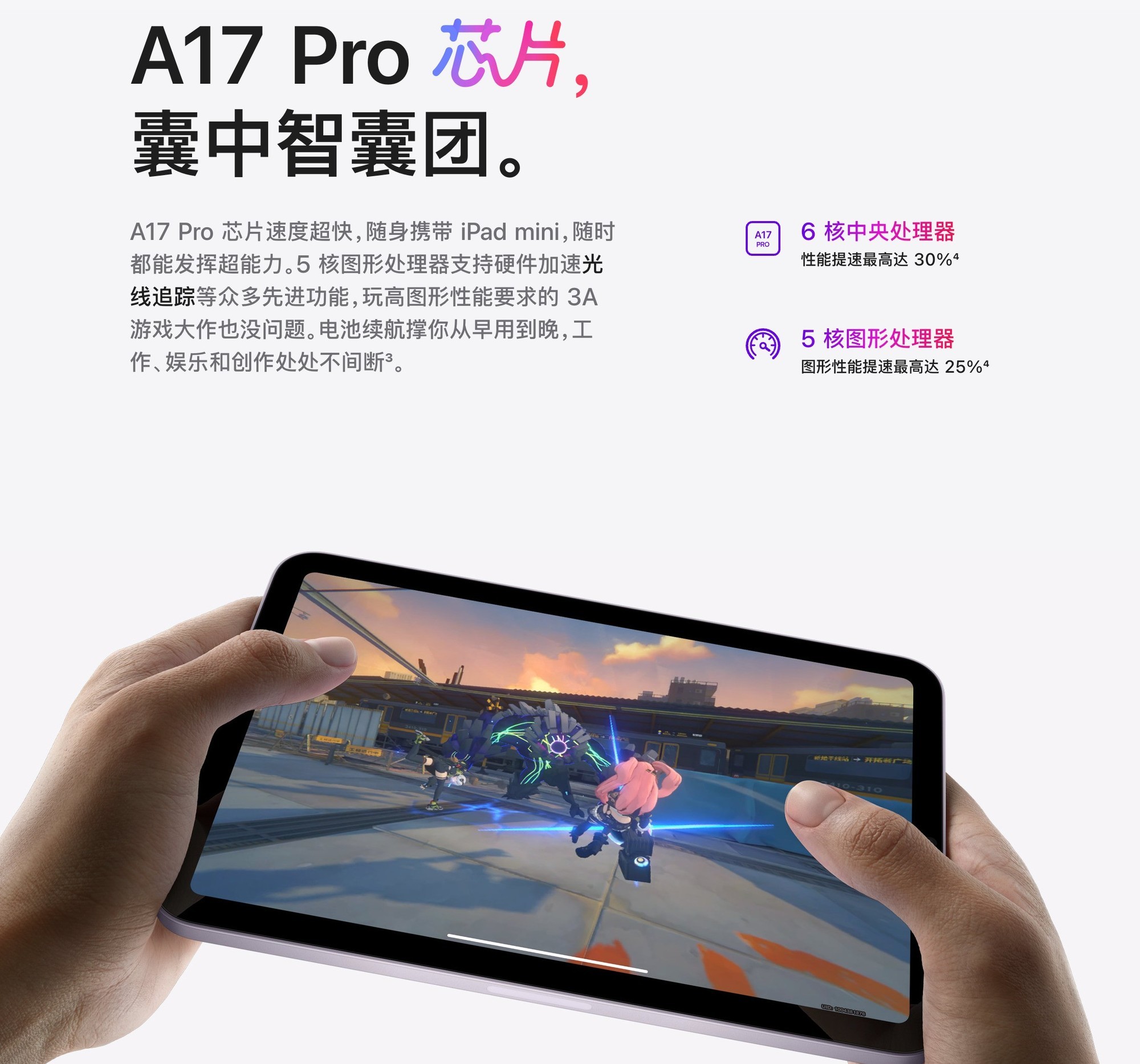 iPad Mini7是一款主打便携和生态的平板,它搭载了A17 Pro芯片,采用台积电4nm工艺,CPU主频高达3.7GHz,性能非常强劲。同时,iPad Mini7还配备了LPDDR5X内存和UFS 4.0闪存,构成了“性能铁三角”,能够轻松应对各种大型游戏和应用。