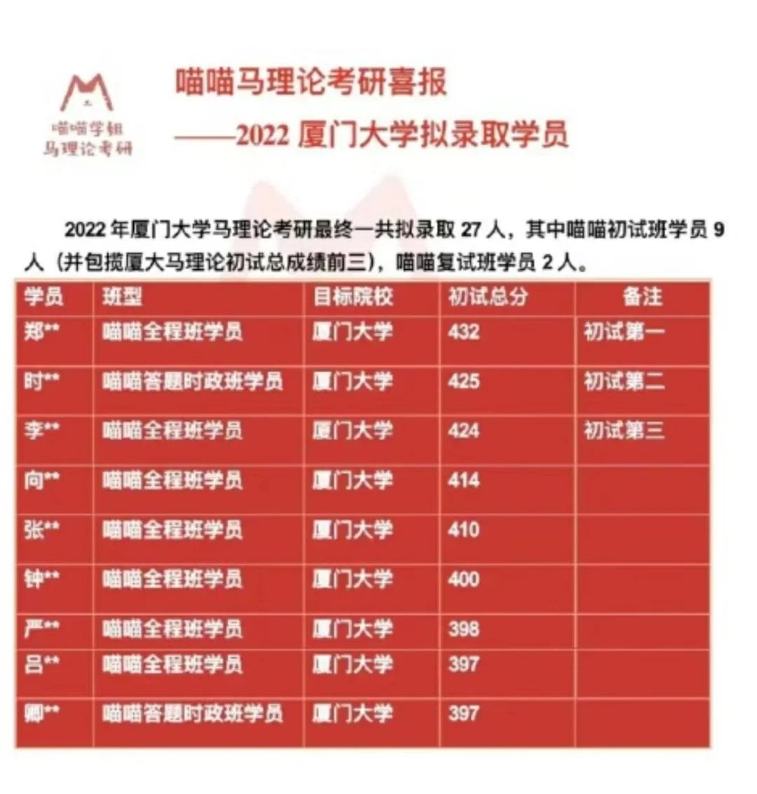 22年有9位喵团初试班学员【包揽初试总成绩前三名】和2位复试班学员上岸厦门大学,其中前三名喵团学员初试成绩分别为432分、425分和424分[鞭炮R][庆祝R][庆祝R]