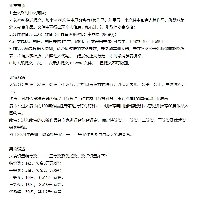 大赛参赛诗歌形式为传统诗词,包括:古体(古风、歌行体)、近体(律、绝)、词曲(不限词牌、曲牌)等。题目自拟,每人限投3首(体裁不得重复)。