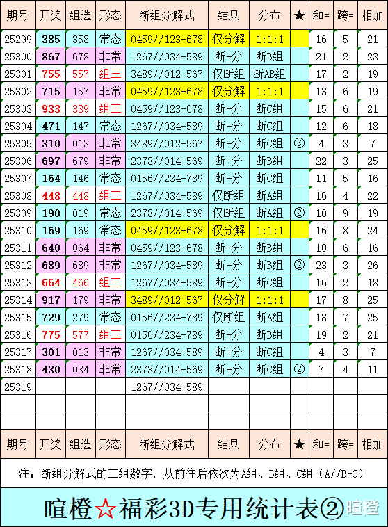 25319期:暄橙福彩3D综合条件(本期超时,仅统计)(本期将在11月29日21:15开)一、上期回顾 ☆1、上期开奖号:4 3 0。2、和值= 7,跨度= 4。3、非常态组六,001路组合。4、热度分布(热:温:冷)0:2:1。二、本期条件 ☆1、三期缺码:2689。2、热:679,温:0134,冷:258。3、断组分解式:1267//034-589。4、本期胆码:超时不发。三、术语解释 ☆1、三期缺码:0至9这十个自然数当中,未在近三期开奖号出现的数字。2、热度(热温冷):自然数0至9,在近七期开奖号中,出现3次及3次以上的数字,称为热码;出现2次的数字,称为温码;出现1次和未出现的数字,称为冷码。某个数字在开奖号中出现几个,就按几次计算。3、断组分解式:将0至9这十个自然数,分成三组数字,从前往后依次为A组(4码)、B组(3码)、C组(3码),一般情况下,有一组数字不出码,偶尔会有两组数字不出码。A组不出码的情况相对较少。断组为主,分解为辅。4、常态组六号码:同时包含大数、小数、奇数、偶数、质数、合数的组六号码,共有72注。统计表中,简称“常态”。5、非常态组六号码:全大数、全小数、全奇数、全偶数、全质数、全合数等六种形态的组六号码,共有48注。统计表中,简称“非常”。★提醒:彩市有风险,参与须谨慎!理性购彩,量力而行!多看少买,不要痴迷!任何条件都有出错的时候!水平有限,仅供参考!友好互动,好运相伴!