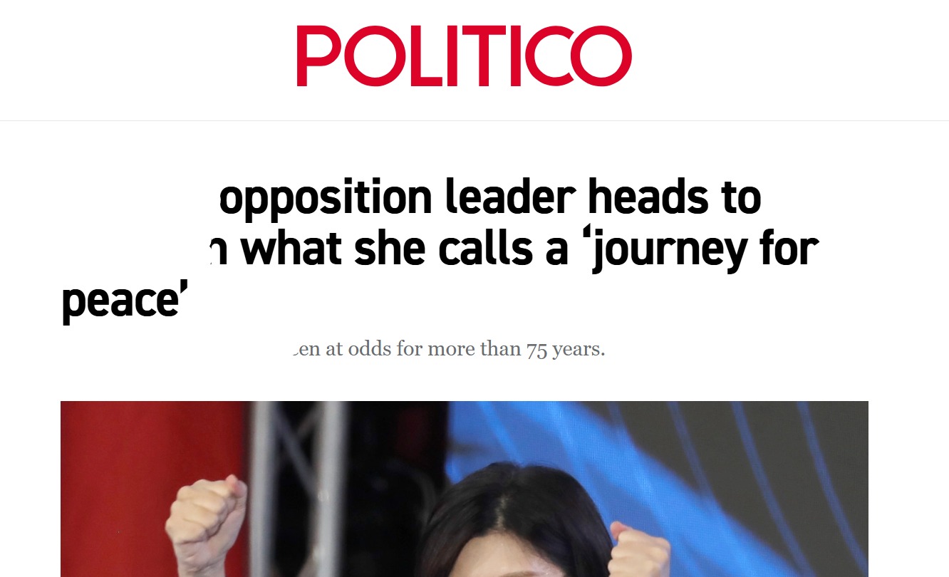 另一家老牌美国政治媒体“政治网”直接在标题中就“揶揄”郑丽文,其表示“台在野领导人前往大陆,开启她号称的‘和平之旅’”——不但用了“she calls(她号称/所谓)”,还在“和平之旅”一词中加了双引号。