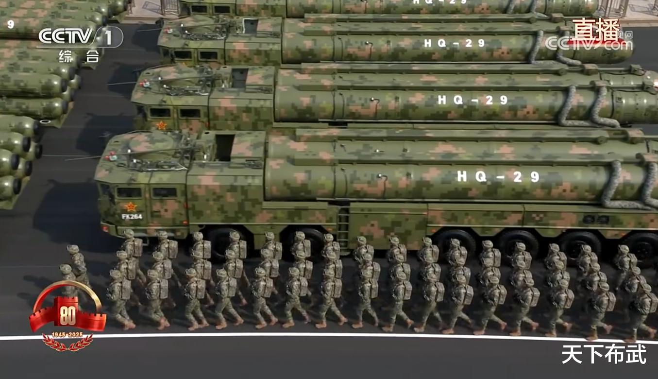 还有防空/反导方队,除了去年刚在珠海航展亮相的红旗-19反导系统之外,此次阅兵我国还首次亮相了双联装的红旗-29反导系统,该反导系统可在大气层外中段拦截远程甚至洲际弹道导弹。预计红旗-29综合水平直接超越了美国的GBI,和美国还在研制的可机动部署的动能拦截弹(KEI)处于同一水平,是守卫我国本土不受核威慑的重要基石。