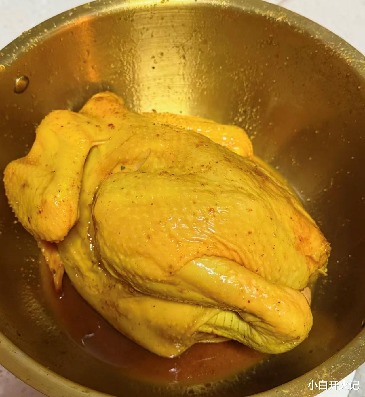 先说鸡,三黄鸡最好,皮薄肉嫩,个头别太大,两斤半左右,胖墩墩的刚好塞满锅底。让摊主帮你剁掉鸡爪尖,回家省心。重点来了:擦干!里里外外用厨房纸吸到一滴水都别想逃,水分是脆皮的天敌。接着给鸡做“马杀鸡”——两勺细盐、一勺糖、半勺白胡椒、两片姜、一小把花椒,像搓澡大叔一样里里外外搓五分钟,连鸡翅膀底下都不放过。搓完别急着下锅,盖保鲜膜冷藏腌两小时,让盐分钻进纤维,肉才有底气说“我入味了”。