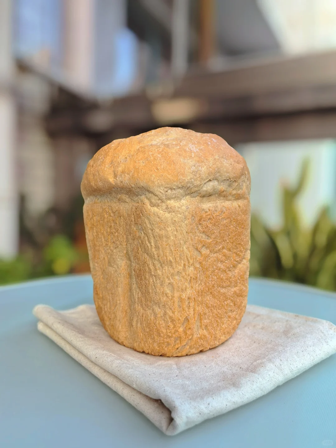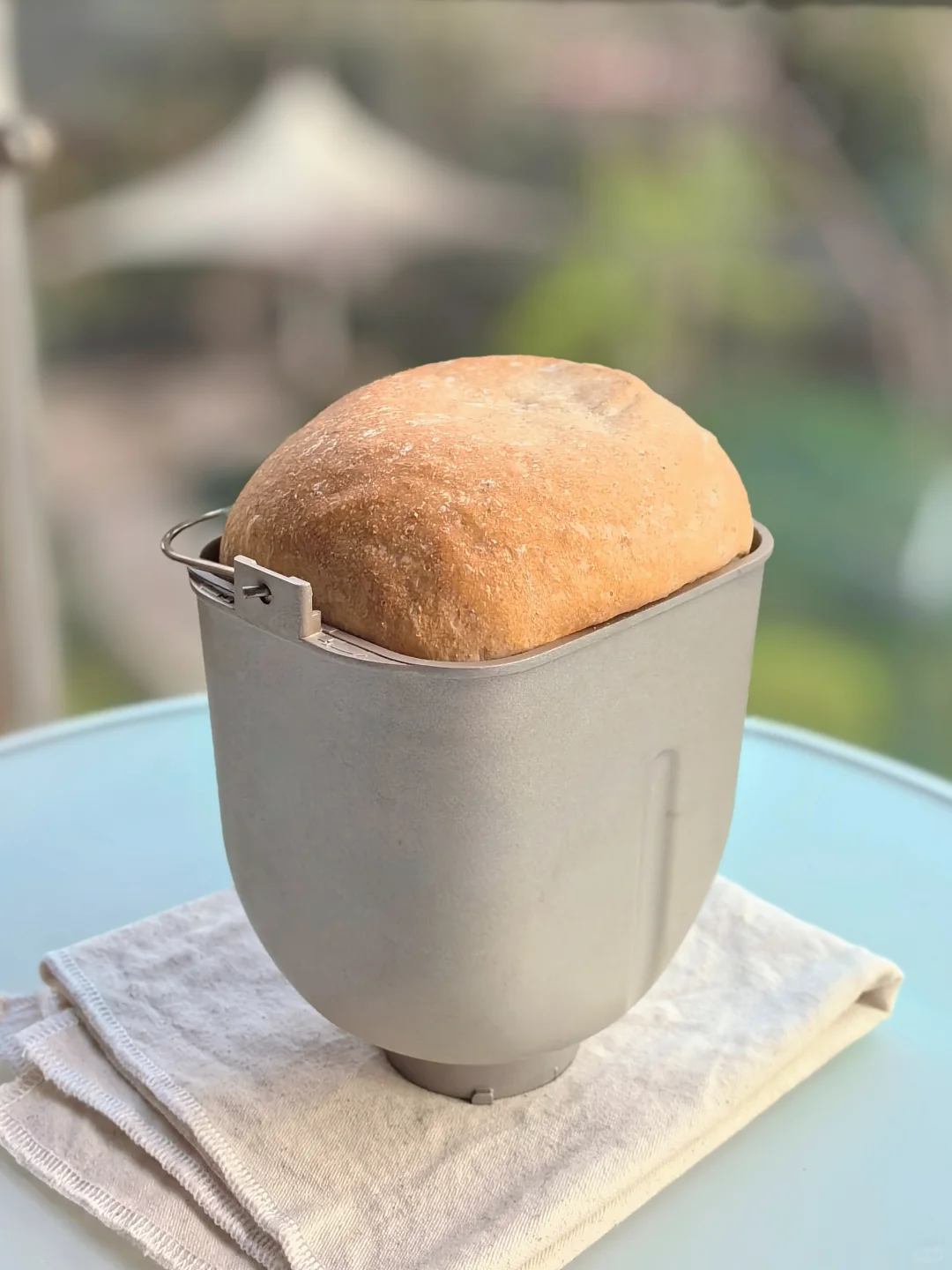 用面包机做过全麦面包的姐妹应该知道,250克面粉的全麦面包是很难满桶的,因为全麦粉会破坏面筋,但是看一下这个图片,居然是爆桶的,惊不惊喜呢?