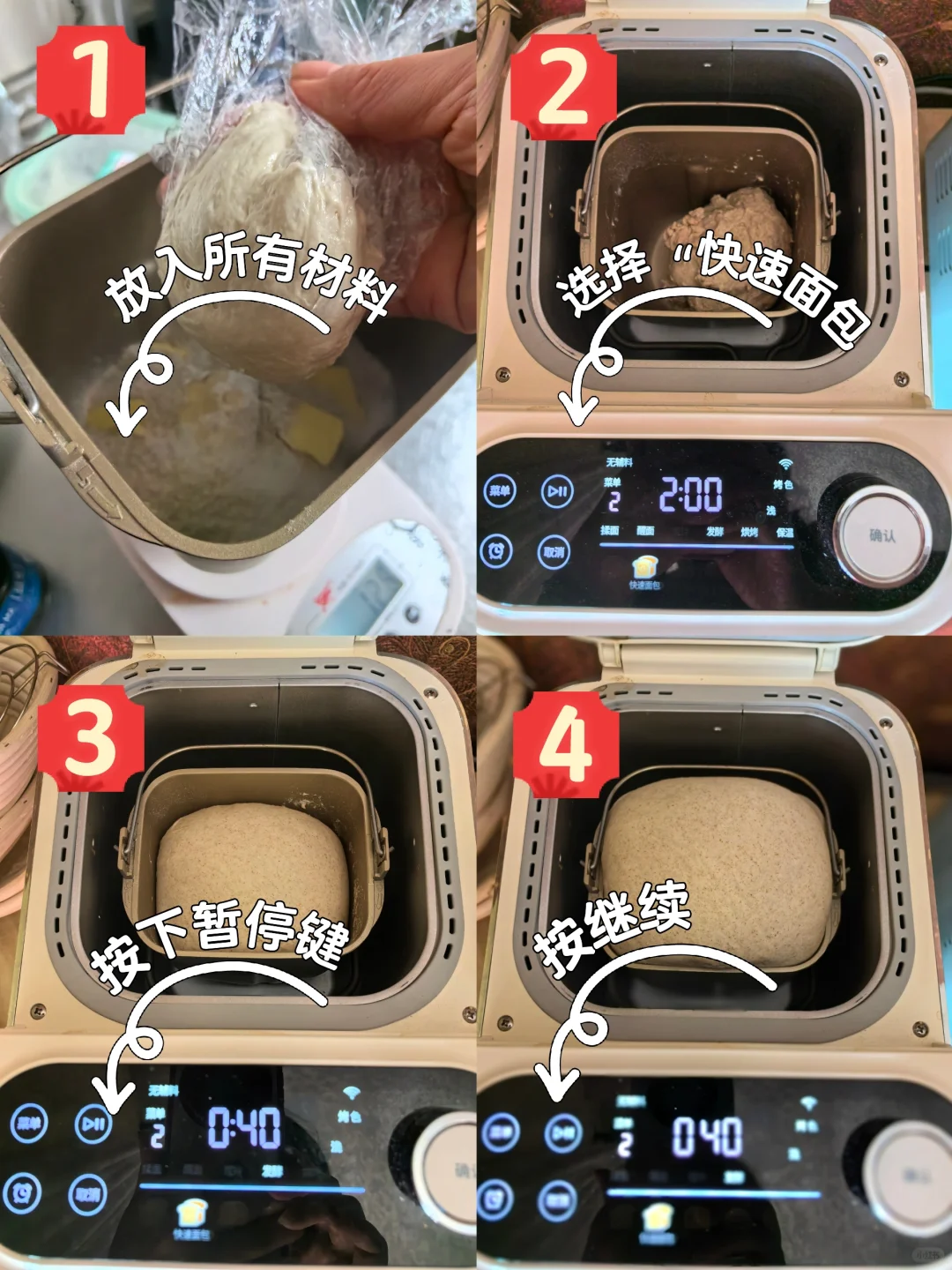 [庆祝R]注意: 在使用“快速面包”菜单时,需在最后烘烤前(离结束还有40分钟的时候)按下暂停键,因为全麦面包需要发酵的时间比较长,等到面包满桶时就可以按继续了。现在的气温,大约暂停30分钟,可以自己设好闹钟,以免忘了。