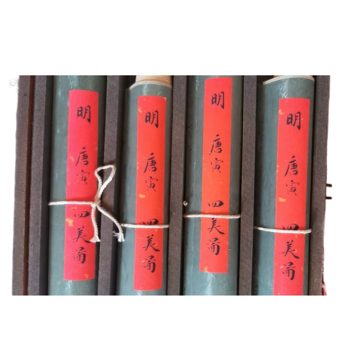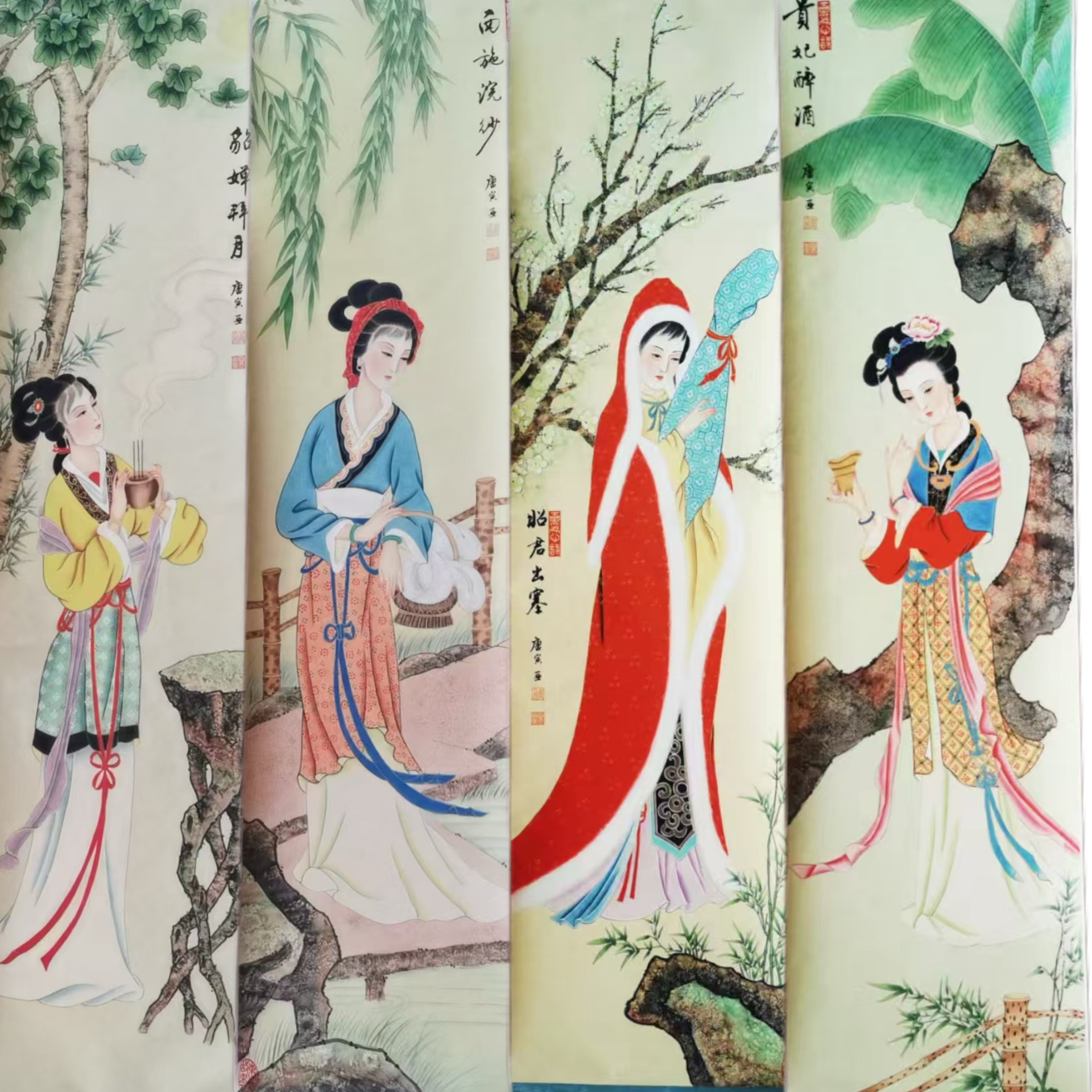 在中国绘画艺术的璀璨星空中,唐寅的《四美图》四条屏犹如一颗散发着独特魅力的明星。这组以 “昭君出塞”“貂蝉拜月”“西施浣纱”“贵妃醉酒” 为主题,尺寸为 117cm×30cm 的画作,不仅是唐寅艺术造诣的卓越体现,更深深烙印着特定的历史背景,是我们窥探当时社会文化、审美风尚与艺术思潮的珍贵窗口。
