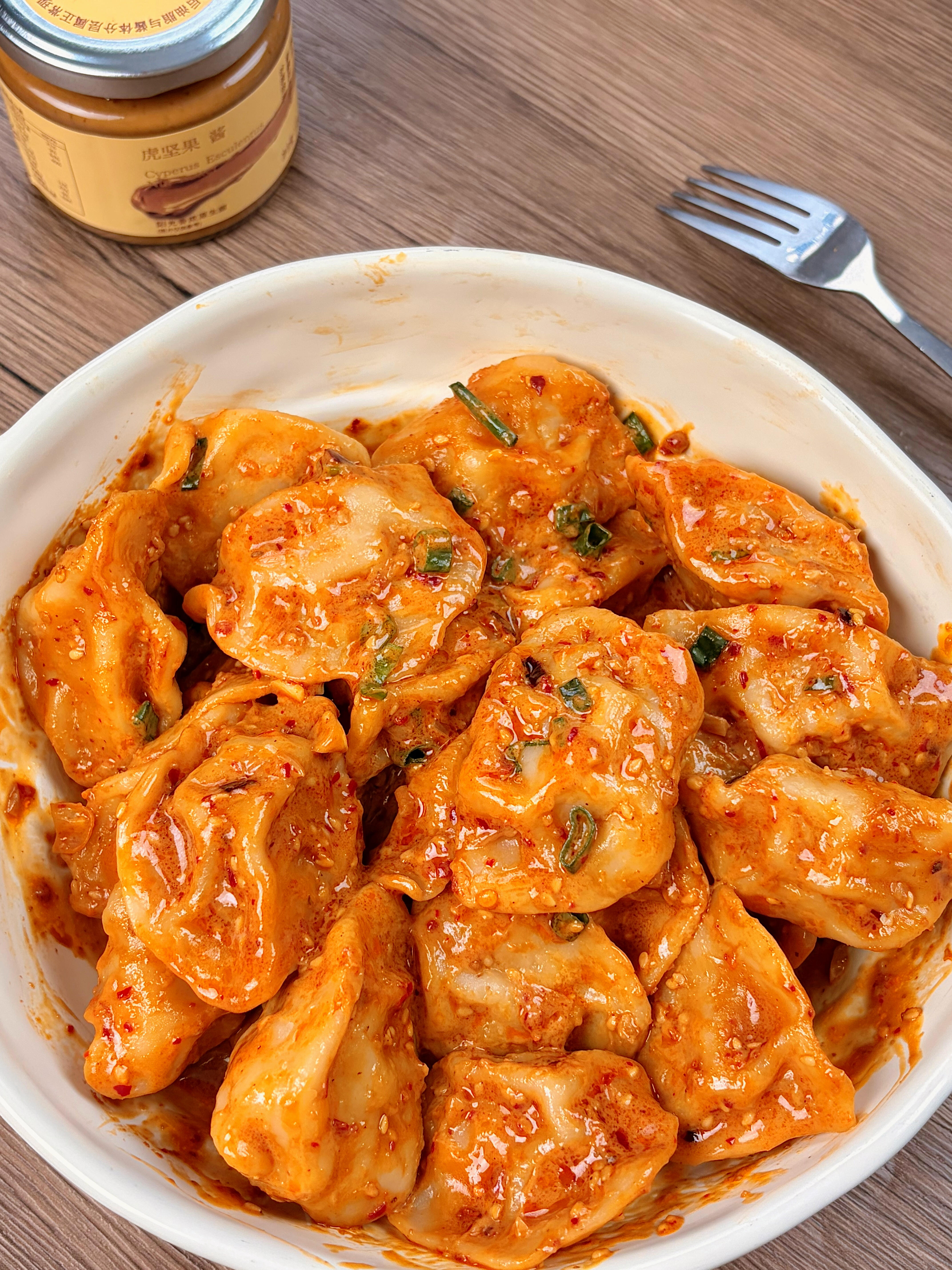 就是让饺子和酱汁完美融合,这也是最让人期待的环节。把煎好的饺子倒进调好的酱汁碗里,或者把酱汁淋在饺子上,用筷子轻轻翻拌,确保每个饺子都均匀裹上酱汁。如果喜欢湿润一点的口感,可以加一勺煮饺子的面汤,让酱汁更顺滑。装盘后撒上一把葱花或者香菜,点缀少许白芝麻,一道色香味俱全的虎酱麻辣拌饺子就完成了。趁热夹起一个,酱汁顺着饺子的褶皱流淌下来,咬开外皮,肉馅的鲜嫩和酱汁的浓郁在嘴里迸发,麻辣中带着坚果的醇厚,还有陈醋的清爽解腻,吃完一个还想再来一个,连盘底的酱汁都忍不住用勺子刮干净。