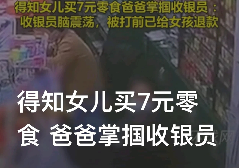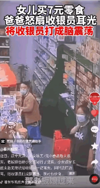 “必须严惩!”辽宁大连,21岁女收银员站在柜台前,一个11岁的小女孩突然进到超市,要买一袋7块钱的零食。收银员接过小女孩递来的100元后,找了她93元,结果没过多久,小女孩又拿着零食回到超市,问可以不可以退货,不退爸爸会打死我的。 收银员不知道怎么处理,一边问老板娘这可以退吗,一边给小女孩说好话,经老板娘同意后,收银员把钱退给了女孩,万万没想到,也就二十分钟左右,一个双手插兜里的男子来到超市,质问谁把零食卖给小女孩的。 看到对方怒气冲冲的模样,收银员有心想躲,但东西是她卖的,对方质问的时候,她不可能不吭声,遂回答说,是她卖的,结果男子顺势就给她一巴掌,啪的一声,直接把收银员扇了个趔趄。 当时老板娘正在超市里,她看到收银员被打,立即上前找男子理论,谁曾想到,男子连她也要一起打,小女孩跟着男子一起来的,男子打人后直接给了小女孩一脚,把她踹进了吧台!