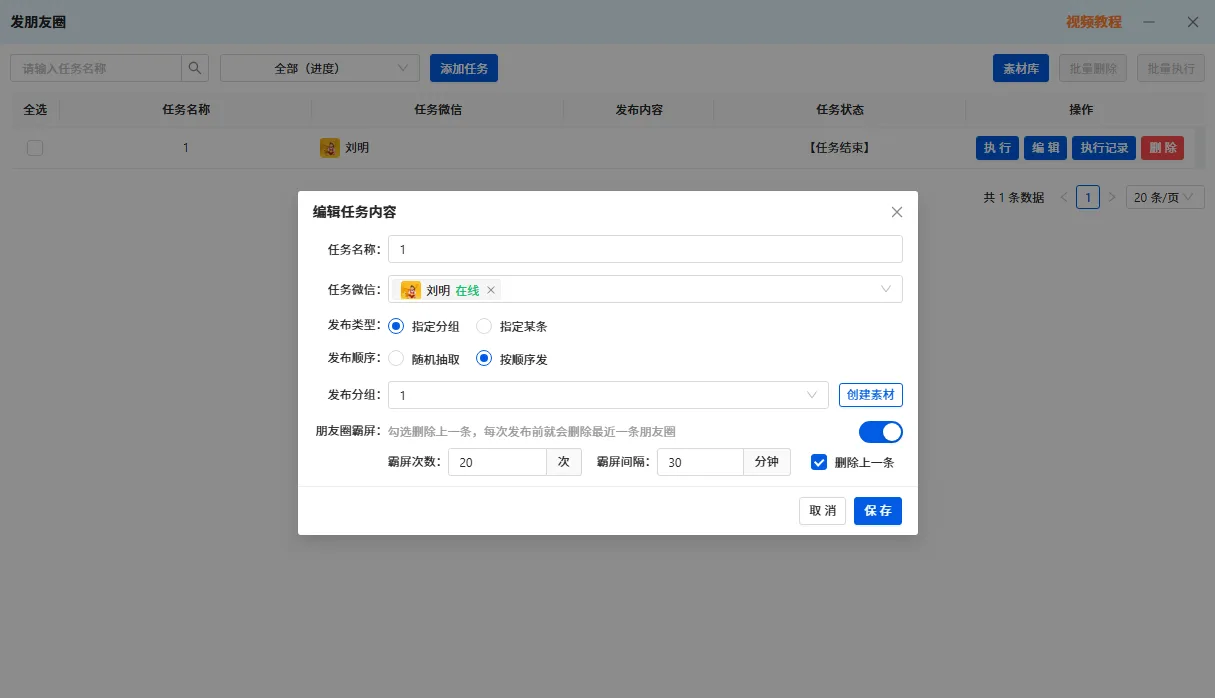 可以设置任务启动后,发多少次朋友圈,自动间隔多久发一次,可以要求RPA系统,从第二次发朋友圈开始,提前自动把上一条朋友圈内容删除。