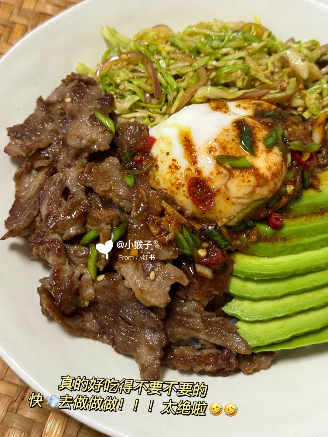 好吃哭了[哭惹R]搭配这个酱汁,还有腌制过的包菜丝脆脆的很入味,牛肉又嫩又香,和米饭拌在一起,好吃到舔碗了😭