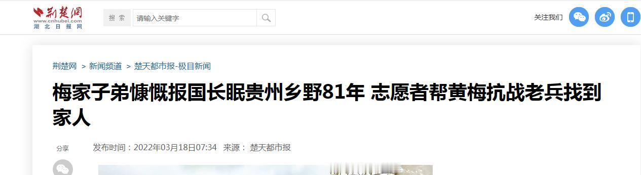2022年,贵州女子给母亲扫墓,发现不远处的孤坟长满了荒草,出于善意,女子将坟墓清理了一番,当她看到墓碑上的文字后,顿时对墓主人肃然起敬,并承诺会帮“他”落叶归根。 这天,贵州一位雷姓女士像往年一样,去给已故母亲祭扫坟墓。 不过,途经一座荒草丛生的坟墓引起了她的注意,以她的经验来看,这座墓很可能已经超过十年无人祭扫了。 雷女士平时比较热心肠,她虽然不知道墓主人是谁,但出于好心,雷女士还是给这座坟的杂草清理一二。 就在她将坟墓前方的杂草清理干净的时候,她发现了一块石碑。 起初,雷女士并未感到异常,毕竟中国人的丧葬习俗就是在墓前立碑,但她对墓里那位逝者的生前身份感到好奇,于是便仔细察看起来。 就是这一瞧,让雷女士心中诧异,这坟里埋葬着的,竟是一位抗战老兵! 碑上刻字虽然已被岁月消磨得模糊不清,但雷女士仍能够看出来,碑的正上方是“湖北省黄梅县”字样,而坟墓所在地是贵州凯里的一个名为“大风洞”的小乡镇。 碑的中心赫然刻着“陆军第五军二十二师工兵营上尉军需梅乐三之墓”的字样,而左侧刻下的是他的牺牲日期:1941年2月13日。 巧合的是,雷女士还是一名抗战老兵慰问团的志愿者,她平日里对贵州籍贯抗战老兵的事务还是比较关注的,对贵州的抗战历史也有所了解。 40年的时候,国军第五军当时在昆仑关跟日本鬼子大战一场,这一战国军以惨重的代价换来了胜利,后来也长期在贵州地区作战,到42年才转入缅甸,成为中国远征军的一部分。 虽然不知道这位名叫梅乐三的英烈因何种原因牺牲,但雷女士的内心深受触动,她瞬间明白了为何这座坟无人祭扫,也希望能够将这位革命先烈送回故里。 于是,她向“老兵回家公益项目”的志愿者请求帮助。 不久,各大社交媒体平台上就出现了帮助梅乐三烈士寻亲回家的信息。 中国人民对革命先烈是无比敬重的,于是这则老兵孤冢流连他乡的消息短时间内便在网上传播开来,许多人主动提供信息,尝试帮助梅乐三烈士“回家”,两地的官方看到消息后,也迅速开展行动。 得益于全国人民的帮助,其中台湾地区的志愿者都加入了寻亲行动,给大陆志愿者发来忠烈祠里梅乐三的牌位信息,还查到了他的兵役资料。 经过多方的走访调查,梅乐三的身份最终得到了确认。 原来,他本是黄梅县蔡山镇黄泥塘村人,当年他参战的时候,还带上了他的儿子梅迪文,父子俩被分配到了同一部队抗日,二人都是队伍里的军需官。 儿子梅迪文早几年已因年老逝去,离世之前,他一直告诫女儿梅燕,一定要找到爷爷,把爷爷接回家,显然,这是梅迪文生前的夙愿。 孙女也一直都在寻找爷爷的坟墓,希望能够实现父亲的愿望。 当有关部门找到梅燕的时候,她很是惊喜,还说起了一些鲜有人知道的往事。 梅乐三和儿子梅迪文所在的工兵营,其营长正是梅乐三的兄弟,当时他们带着一帮梅姓兄弟离家抗战,战争结束后顺利回到家的却只有零零散散几个人。 在解放战争胜利之后,梅迪文其所在部队接受解放军改编,退伍之后便当起了工人。 他也曾数次到大风洞乡寻找父亲的坟墓,但无奈时过境迁,他也并不知道具体的地点,所以一直都没找到,这也成了梅迪文生前念念不忘的心结。 这之后,孙女梅燕便将爷爷的墓迁到了昆明,与父亲同葬一处,时隔八十余年,梅乐三烈士终于“回”到了亲人身边。 (信息来源:《梅家子弟慷慨报国长眠贵州乡野81年 志愿者帮黄梅抗战老兵找到家人》——荆楚网)