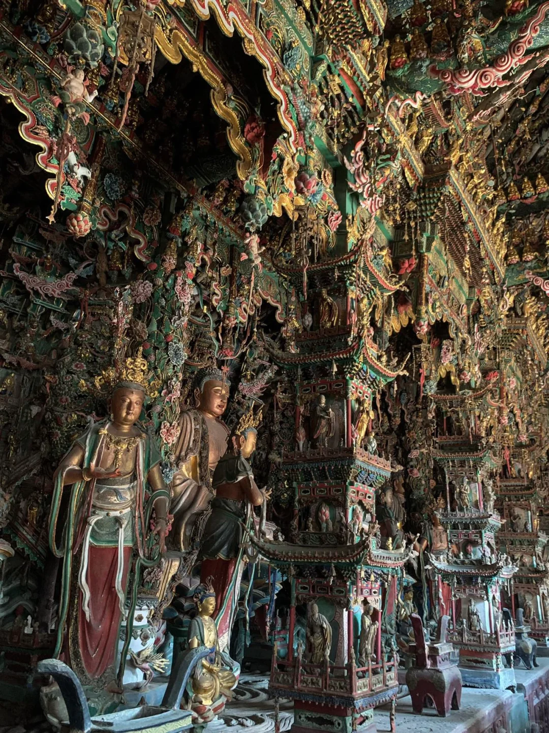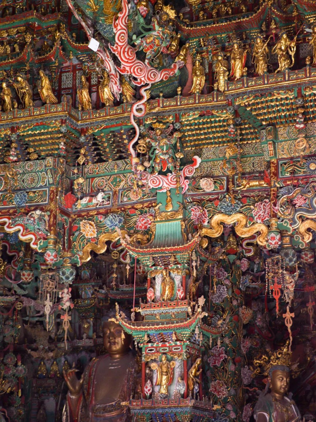 用上千尊彩塑及悬塑填满217平的大雄宝殿,或悬梁、或挂壁、或层层叠起,这些塑像布满横梁及山墙,呈现出一派仙宫佛国的景象。