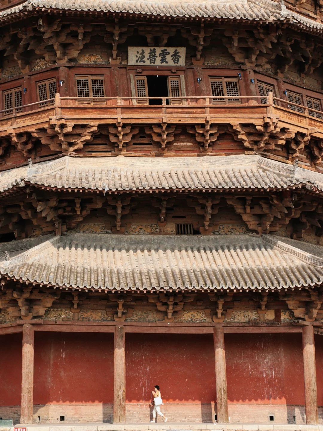 最高最古老的辽代木塔,全塔共用了35种不同形制的斗拱,塔内仍保留辽塑及辽壁画。虽只能抵达一层但也足以被这砍尽黄花粱建起的应州塔震撼到。