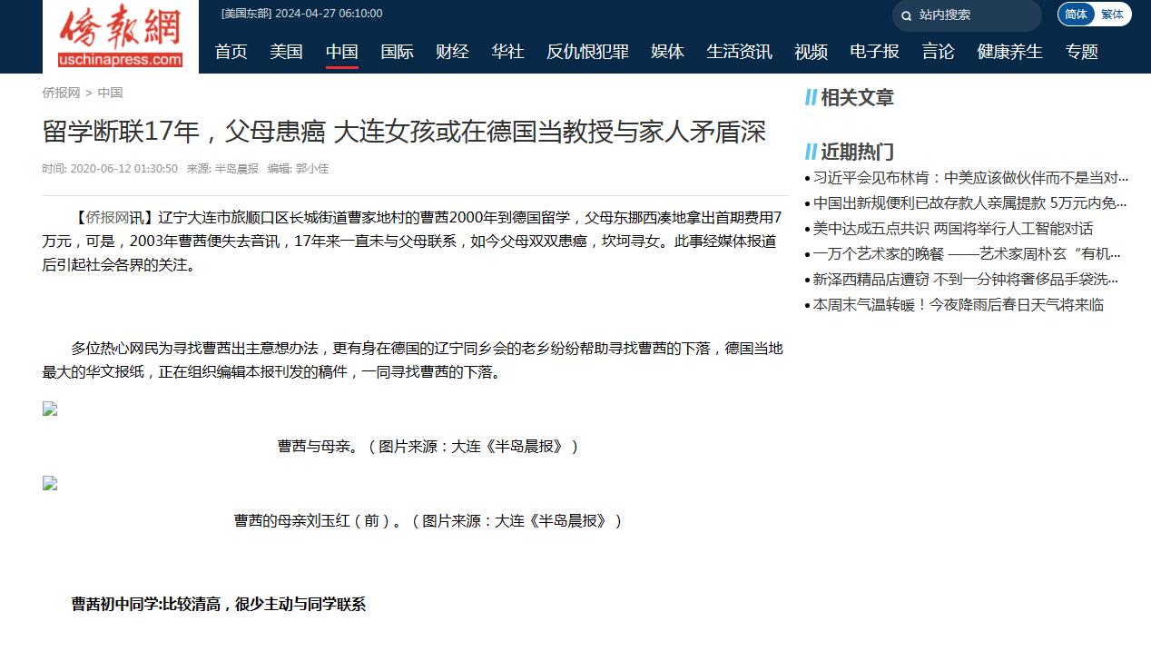 辽宁大连,2000年,一对农村夫妇借7万元,将女儿送出国留学,没想到,此后女儿人间蒸发,21年后,父母临终前才听说,女儿不仅活着,还是德国的一名教授,并已改名换姓。这是真的吗,曹倩究竟在哪? 1979年,在辽宁的一个小农村里,一个小女婴呱呱坠地,一家人给她取名叫曹茜。父母对她的降临充满期待,然而当她落地的那刻,家里气氛却骤然沉重下来,只因她是女孩。 在这个重男轻女的家族中,女孩的出生并没有带来预期的喜悦。从此,全家对她寄予了极大的期望,希望能够培养出一个出色的人才,能够光耀门楣。 然而,这份过高的期望对小小的曹茜来说无疑是一副沉重的枷锁。她失去了无忧无虑的童年,生活中的一切都被父母严密地控制。 学习成了她唯一的人生任务,而她则变成了家中的学习机器。每当她试图摆脱这种压力,父亲就会以严厉的方式将她拉回正轨。 在压抑的童年和青春期,曹茜曾试图逃离这个束缚她的牢笼。在人生的转折点——高考填写志愿时,她偷偷地报考了远在广东的中山大学,期待着借此离开家乡,脱离父母严苛的管教。 但不幸的是,这一切都在她不知情的情况下被改变,她被录取到了辽宁师范大学。 当她愤怒地质问父母时,得到的只是一句冷漠的回答:“这是为了你好。”这次事件让本就脆弱的关系雪上加霜。 在辽宁师范大学学习的岁月中,曹茜化悲愤为力量,她发奋苦读,最终以优异的成绩获得了出国留学的机会。经过一系列的努力和说服,父母最终答应了资助她去德国深造。 2000年,满怀憧憬的她独自踏上了前往异国他乡的飞机。 然而,初到德国的曹茜很快就体会到了生活的艰难。语言障碍、饮食习惯差异以及高昂的生活成本让她倍感压力。 迫于生计,她开始打起了临时工,但由于签证问题,这些工作都属于黑工,收入微薄且常被剥削。在最困难的时候,她想起了千里之外的父母,于是鼓起勇气向他们求助。 虽然一开始遭到了父亲的反对,但他终究不忍看着女儿受苦,费劲心力筹借了3万元寄给了曹茜。 时间推移到了2003年,这一次曹茜再次向父母伸出了求援之手。而父亲的回答却是冷冰冰的指责:“我还以为你死了呢!”这句话成为了父女之间的最后一次对话。 从那次电话挂断之后,曹茜仿佛人间蒸发,彻底消失了踪迹。 随着岁月的流逝,当初的老两口被病痛缠身。在癌症的折磨下,他们自知时日无多,心中唯一的愿望就是再见女儿一面。 他们登上了寻人启事,希望唤起女儿的良知,让他们在最后的日子里得到些许慰藉。这则新闻随即引发了社会各界的关注与讨论。 就在这个时候,从曹茜的同窗好友那里传来了消息。令人诧异的是,如今的曹茜非但没有遇难,反而已是大学教授之身,家庭事业皆美满富足。 更令人难以理解的是,早在2004年的一次回国交流中,她特意安排了行程与旧日的好友相见,惟独避开了自己的亲生父母。 在2021年,两位老人因病加重不幸离世。他们生前最牵挂的女儿始终未曾现身,留下了一段无法释怀的遗憾。 媒体的多次联系均未得到曹茜的回复,外界无法得知其内心的真实想法。至此,这场家庭悲剧在无尽的沉默和猜疑中划上了句号。 (信息来源:侨报网——《留学断联17年,父母患癌 大连女孩或在德国当教授与家人矛盾深 》)