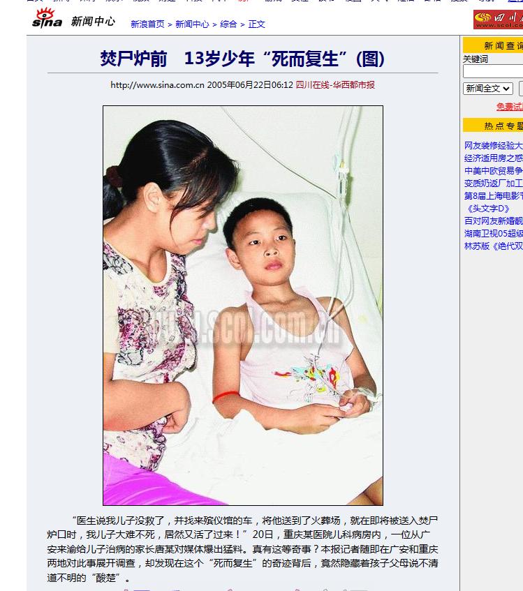 2005年广安一殡仪馆,黄师傅正将一具13岁男孩尸体,推入焚尸炉,突然,尸体右腿抬了一下,黄师傅以为自己眼花,哪知道,尸体竟开口要饭吃,黄师傅顿时吓得魂飞魄散,镇定下来后,连忙端来一碗稀饭,喂给男孩吃! 生命的脆弱,就像一根易折的细绳,随时可能断裂,生命的珍贵,却如明珠般熠熠生辉,闪耀着独特的光芒。两个小男孩的经历,让我们再次看到生命的两面性。 唐力和小风,一个13岁,一个年纪更小,本应该是快乐无忧的年纪。 可是命运却开了一个残酷的玩笑,两人几乎在同一时间遭受了致命的疾病袭击。他们先是高烧不退,随后病情加重,双双濒临死亡边缘。 唐力的父母忙于打工,无暇照顾,只能将他送往市里的医院抢救。可尽管医生日夜奋战,经过三天的努力,孩子的生命体征仍一直处于危殆状态。 眼见希望渺茫,医生只能宣告救活可能性不大。 小风的遭遇也不比唐力好多少。父母远在他乡打拼,只能将孩子托付给年迈的爷爷奶奶照看。 在村医和市里医院的治疗下,小风的病情一度好转,可随后又出现逆转,情况一直恶化。医生不得不通知家属,病危难治。 面对这一切,两户人家无不痛彻心扉。他们冥冥之中感受到了死神的威胁,那枷锁般的恐惧笼罩着每个人。 唐力的家人按照医嘱将孩子送往殡仪馆,准备在晚上9点后火化。小风的家人由于经济拮据,不忍目睹孩子被焚烧的一幕,决定9点后再来领取骨灰。 生死其实就在一念之间。如果非要按部就班地将两个孩子火化,那么就真的永远失去了他们。可是天无绝人之路,就在这危急关头,上天给了他们一线生机。 当晚,火化师傅黄师傅按照惯例对两具"遗体"进行检查。 就在这个过程中,一个令人难以置信的场景发生了--原本毫无生命迹象的唐力和小风的右腿竟然抬了起来,而且还传来了微弱的呼救声。这不啻于一声惊雷,狠狠地击碎了死亡的枷锁。 黄师傅当机立断,为唐力喂了些食物,同时立即通知了领导。 在确认两个孩子确实还有生命体征后,他们被紧急送往专业医院抢救。经过医生的精心治疗,两个小生命终于走出了鬼门关。 不过孩子们的遭遇也让人感叹,无常的生命如此脆弱易逝,又如此珍贵无价。 唐力事后说,自己根本没有死而复生的感觉,不过就是睡了一个很长的觉。而小风,虽然捡回了一条命,但还是留下了一些后遗症——脑部受损,反应迟钝。 两个孩子能活下来,完全是由于一系列巧合和人为努力的结果。 如果当初家人们没有选择在晚上9点后火化,如果黄师傅不是一个细心的人,如果医院的救治不够及时,结果可能会是毁灭性的。 也正因为这些有利因素的存在,才让这对男孩重新拥抱了生命的馈赠。 生命的可贵不言而喻。对于唐力和小风来说,这个机会无疑是上天重新赐予的恩赐。我们更应该意识到,每个生命都如此宝贵,都应该被珍惜和呵护。 (信息来源:四川在线-华西都市报——《焚尸炉前 13岁少年“死而复生”(图)》)