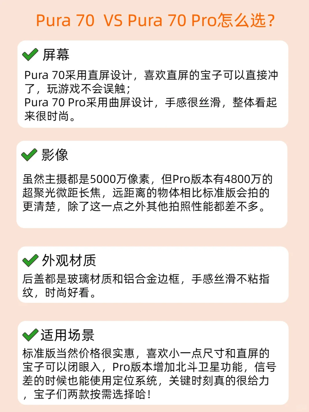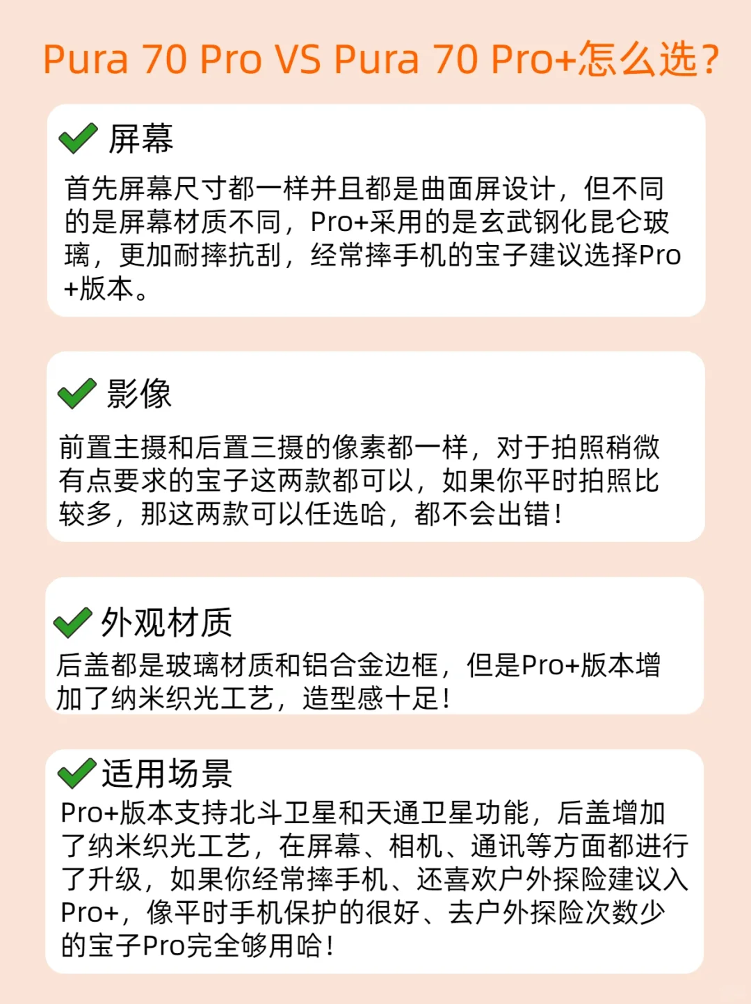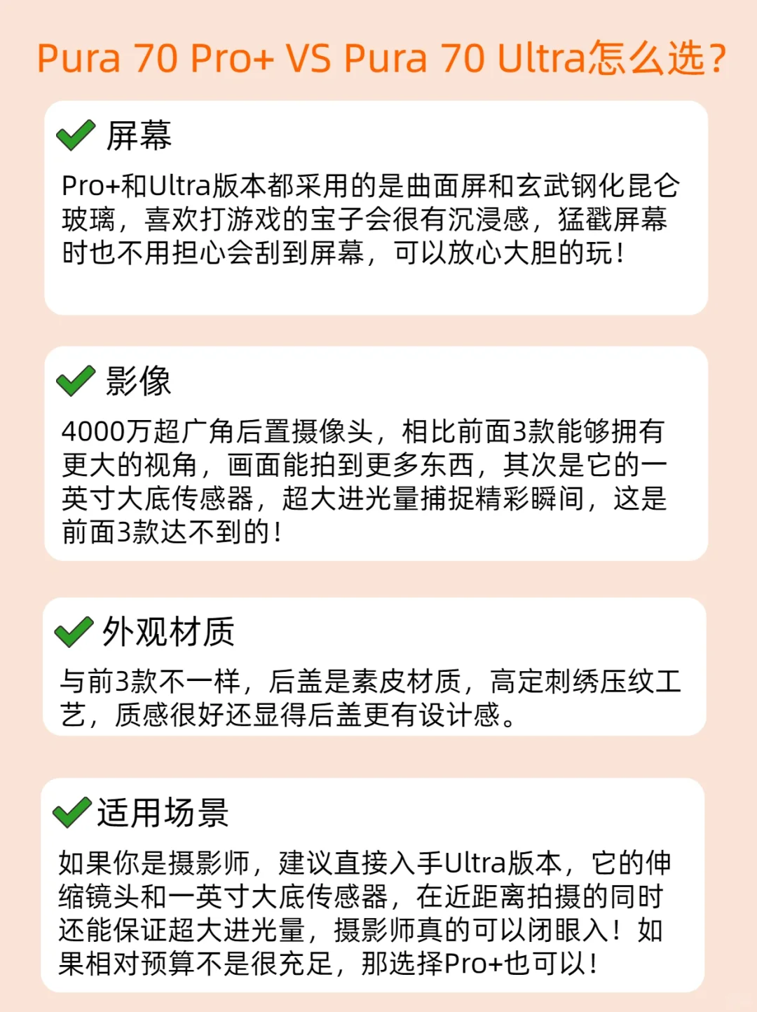 👀还在观望Pura 70的宝子们先别急!先看看这期选购指南,防止踩坑❗️ 👉🏻这次从屏幕、影像、价格等方面详细讲解了全系列的区别以及适用人群🚶♀️➡️ 1️⃣屏幕 2️⃣影像 3️⃣价格 4️⃣购买建议 👆🏻综合上面的参数和价格,宝子们对号入座哈!