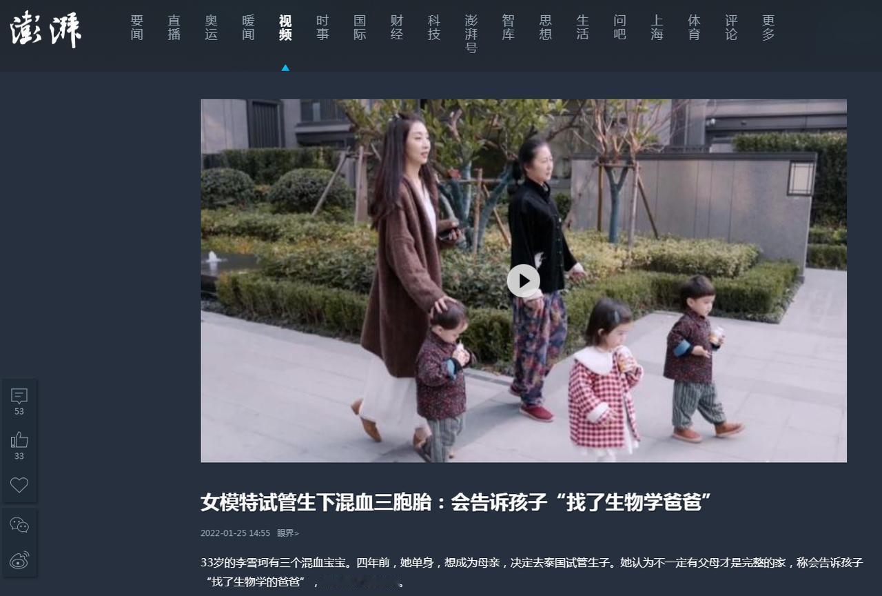 “我不需要男人!”2018年,山东29岁女孩跑到泰国做试管婴儿,重金买下了一个英国人的精子,一口气生下三个混血宝宝。 在闪耀着迷人光芒的T台之上,李雪珂曾经是那个备受追捧的焦点。17岁就赢得上海超级模特大赛桂冠,开启了她的职业生涯。 一时间,她成了无数杂志的封面女郎,男女老少的目光都被她娇俏的容颜和完美的身材所吸引。 美艳动人的她,自然也吸引了无数追求者的青睐。当时的李雪珂对爱情依然怀有美好的憧憬,以"终身陪伴"为出发点,她尝试了几段恋爱。 然而,这些感情最终都无疾而终。 起初,李雪珂会自我反省,怀疑是否是自身原因导致了感情破裂。但随着时间推移,她渐渐意识到,并非如此。 相反,她开始厌倦那种所谓"美好爱情"的追求,对此失去了最初的期待和憧憬。既然内心早已淡然,为什么还要勉强自己呢? 随着社会不断进步,科技的发展也为人们带来了新的生活方式选择。比如,现在想要孩子,也不一定需要异性的参与了。 试管婴儿技术的出现,让李雪珂看到了一条通往幸福的新路径。作为一个事业有成但并不渴望恋爱的女性,她为何不能拥有自己的家庭和孩子呢? 就这样,一个大胆的想法在她心里逐渐成型。 2018年,怀着试管婴儿的计划,李雪珂前往泰国考察。经过三个月的时间,她终于通过中介选定了一家信誉良好的医院,并选择了一名英国人的精子样本。 后来,三个受精卵被成功植入了她的子宫。 一切进展顺利,李雪珂成功怀孕了!但等待她的,却是另一个困扰:自己这种选择,能否得到家人的理解和支持? 毕竟,试管婴儿在当时还不算是主流。李雪珂的家人算是较为传统的,她曾暗中试探过母亲对此的看法。 果不其然,母亲坚决表示反对,担心她这么做会给事业带来不利影响,受到舆论的非议。 为了不增加母亲的负担,李雪珂决定先将这个秘密藏起来。以工作为由长期离家,一直到2019年,三个可爱的孩子终于平安降生。 当母亲发现自己竟连孙子孙女都有时,虽大为震惊并感到愤怒,但最终也无可奈何。孩子都已经出生在这世上,她又能如何呢?更何况,李雪珂作为单身母亲,独自照顾三个孩子注定是个艰难的过程。 刚出生的那段时间,李雪珂几乎就成了一台"喂奶机器"。刚喂饱一个,另外两个就开始大哭,去哄另外两个,这个又会不安。 但当她看到怀中的孩子,母爱总是会冲散她心中的不悦,渐渐地,她也习惯了这种生活,并为之感到快乐,成为母亲以后,她变得比以前更有耐心了。 后来,李雪珂大大方方地承认了自己的做法。在她看来,既然孩子们已经来到这个世上,这是自己的选择,也没有必要隐瞒掩盖。 至于孩子们将来会问及父亲的事,李雪珂也早已有了打算。 她会把一切经过如实告知,并郑重承诺:尽管缺少了父亲,但她一定会用自己的全部能量和决心,竭尽全力将他们养育成人。 李雪珂深知,成为母亲的道路注定是崎岖且漫长的。但她内心有股力量支撑着自己:单亲家庭的成长经历让她深切体会到一个母亲对孩子的爱是无私而伟大的。 正是母亲的爱,曾让李雪珂充满自信,努力成为出色的舞者和模特。 如今,成为母亲的她,也将以同样的爱护佑着自己的孩子们,在这条未知的路上阔步前行。 (信息来源:《女模特试管生下混血三胞胎:会告诉孩子“找了生物学爸爸”》——澎湃新闻)