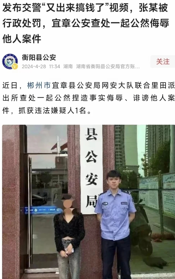 慎言,湖南郴州一女孩,因视频里一句话“又出来搞钱了”,被宜章县公安进行行政处罚。