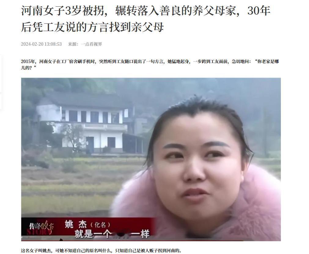 2015年,河南一女子在工厂干活时,听到同事说了一句方言,她猛地回过头,抓住同事的手问:“你老家是哪里的?”同事被她吓了一跳,说出家乡的名字,没想到女子二话没说就买了去那里的车票。 被拐卖的惨痛经历,让姚杰对亲生父母的身影记忆模糊。尽管被一对好人收养,她内心依旧蛰伏着寻根的渴望。生命中这段遗憾的缺憾,像一块尘封的拼图,时刻提醒着她去找寻答案。 时光飞逝,转眼姚杰已是结了婚。一次意外的对话,竟然成为了她解开心结的线索。工友口中那熟悉的方言,仿佛拨动了心底深处的某根神经,让她对自己身世的疑惑浮出水面。 这个听起来平凡的对话,对姚杰而言却有着非凡的意义。 工友描绘出的家乡景象,勾起了她深埋在潜意识中的记忆画面:一条穿镇而过的大江,江面上坚韧的渔船忙碌穿梭,勤劳的渔民在阳光下操作渔网。 脑海里这熟悉却又模糊的场景,她知道,自己真正的根就在那个神秘的地方。 姚杰把这个发现欢欢喜喜地告诉了丈夫,丈夫看出妻子眼中的期盼,他深知妻子多年来寻根的夙愿。丈夫宽厚的性格和滚烫的爱,让他在第一时间选择了全力支持妻子,与她并肩踏上了这条寻根之路。 凭借着对那个地方的一点蛛丝马迹,姚杰和丈夫做足了功课,终于锁定了重庆合川区涞滩镇。抵达后,镇上的一切仿若让她找回了久违的亲切感,彷如命运在这里等候多时。姚杰留下了DNA,并开启了漫漫寻亲之路。 夫妻俩暂时分头行动,丈夫则在城里贴起寻亲启事,向途人打听线索。这样绝望而艰辛的日子一天天过去,姚杰的心情起起落落,偶尔也会动摇想要放弃。幸运的是,在即将离开前的最后关头,一个救星出现了。 姓唐的热心大婶无意中瞥见了丈夫贴的寻亲启事,她想起村里的一户人家很久以前就丢失了一个女儿,孩子的一些特征竟与启事上的描述不谋而合。大婶连忙将启事交到这户人家手中。 这个消息如一把火种,为王琼夫妇点燃了重拾希望的火苗。二人望着启事上的照片,仔细端详着孩子的五官和体态,不由得想起了当年女儿失踪的情景,泪水夺眶而出。 王琼夫妻带着一丝渺茫的期望赶到了公安局,见到了姚杰的亲身模样。眼角下的痣、腰部的疤痕,这一切细节再次印证了王琼的直觉。 双方随即进行了DNA亲子鉴定,等待焦虑而漫长的时间过去,鉴定结果终于揭晓,喜讯如闪电般撕开黑暗,时隔多年,母女真的再次相见了! 落地生根三十载,漂泊异乡无所依。姚杰与王琼相拥而泣,久违的亲情在泪水的浸润下苏醒重生,一家三口尽释了永不相见的梦魇。 如火的温暖甘苦并存,虽然姚杰已成家立业,但王琼依然希望女儿常回老家,把当年缺失的时光一点一滴去弥补。 人生路漫漫,虽然艰辛无垠,但只要坚持就一定会有希望。姚杰和王琼的故事令人感动和勉励。 同时,我们也要提高警惕,严惩拐卖犯罪份子,让每个孩子都可以在父母的呵护下健康快乐地成长,免遭失散的折磨。值此佳节,我们向仍在寻找亲人的家庭献上祝福,愿他们也能早日像姚杰一家这样团聚。 (信息来源:《河南女子3岁被拐,辗转落入善良的养父母家,30年后凭工友说的方言找到亲父母》——顶端新闻)