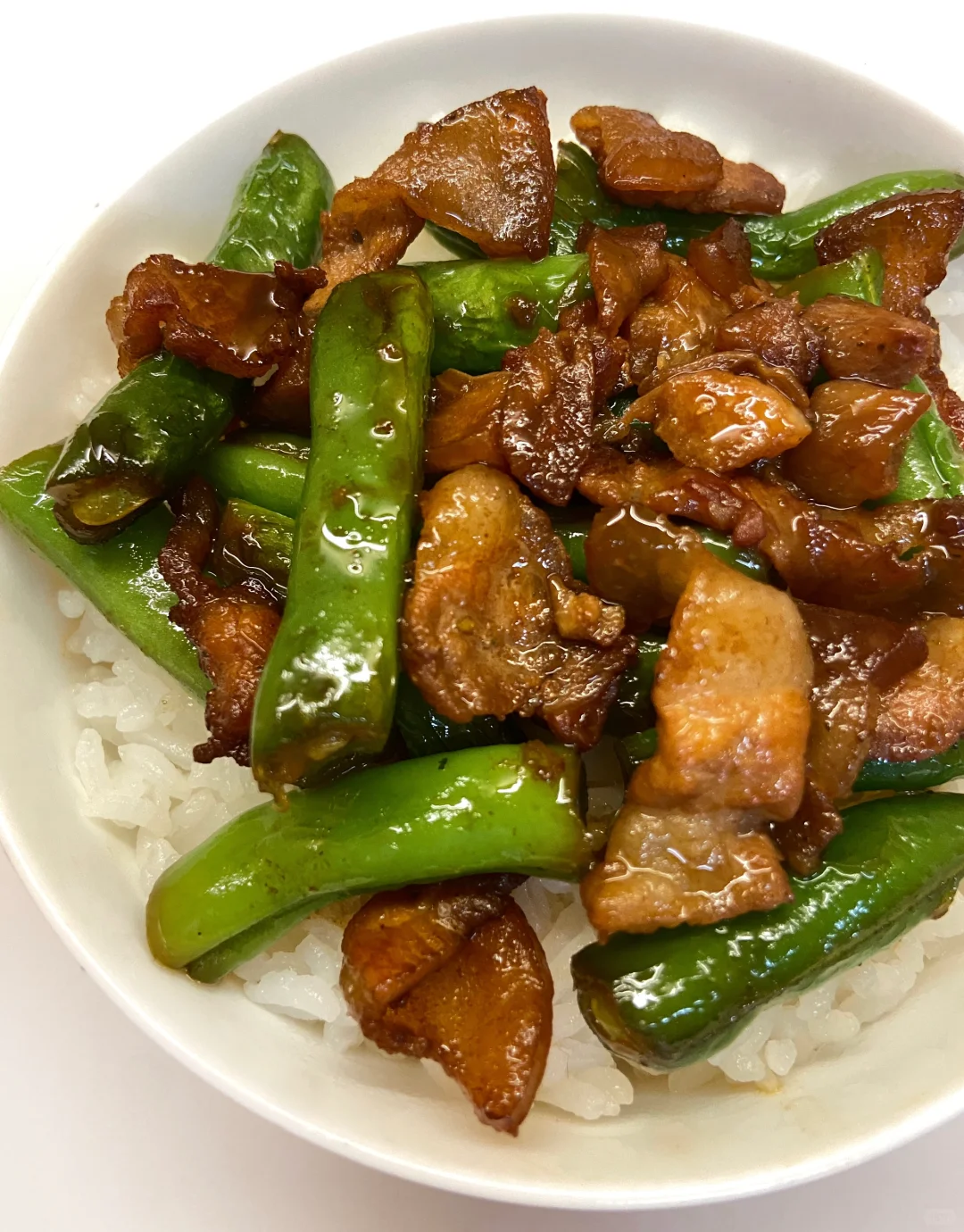 四季豆五花肉 五花肉炒出油可以乘出一些 这样不会很油 四季豆要先加盐炒比较入味 加水闷熟即可