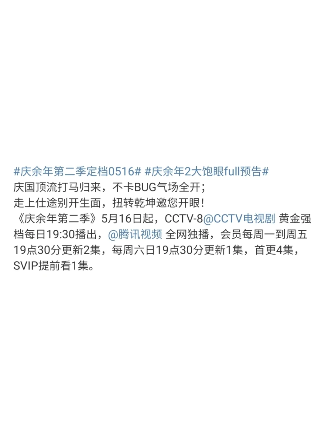 《庆余年第二季》5月16日起,央八 黄金强档每日19:30播出, 会员每周一到周五19点30分更新2集,每周六日19点30分更新1集,首更4集,SVIP提前看1集。 . 📺:庆余年2 (36集) 📺:古装 📺:张若昀李沁陈道明吴刚郭麒麟田雨李小冉宋轶辛芷蕾高曙光李强于洋刘端端张昊唯佟梦实金晨王晓晨吴幸键毛晓彤高露隋俊波 📺:2024.5.16央8腾讯视频 .
