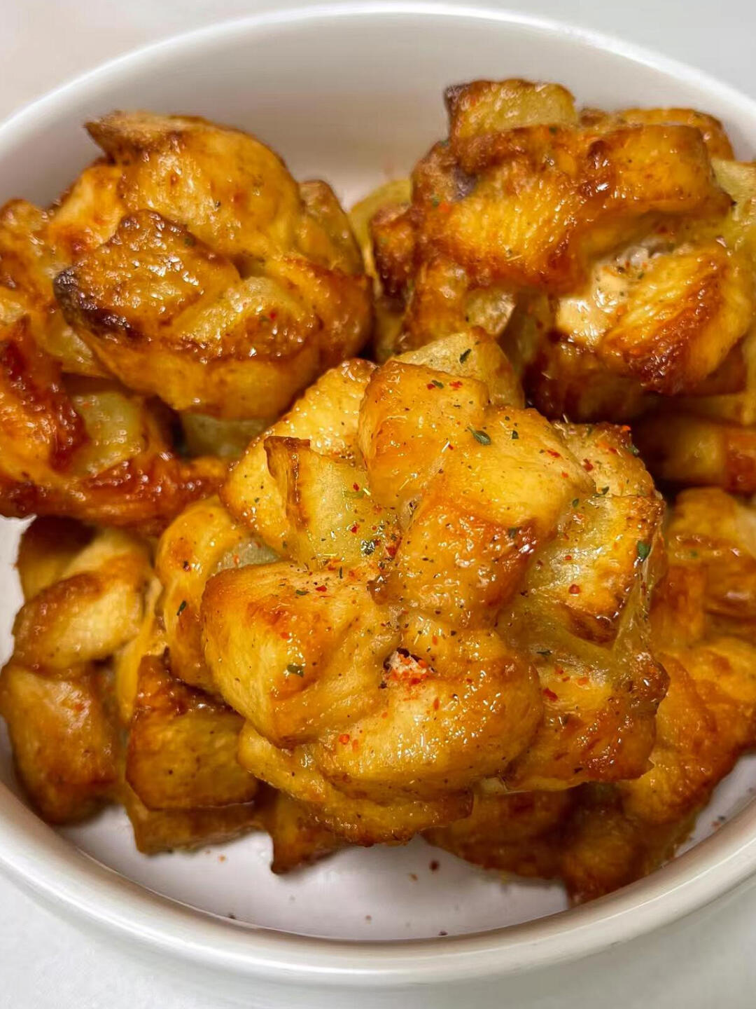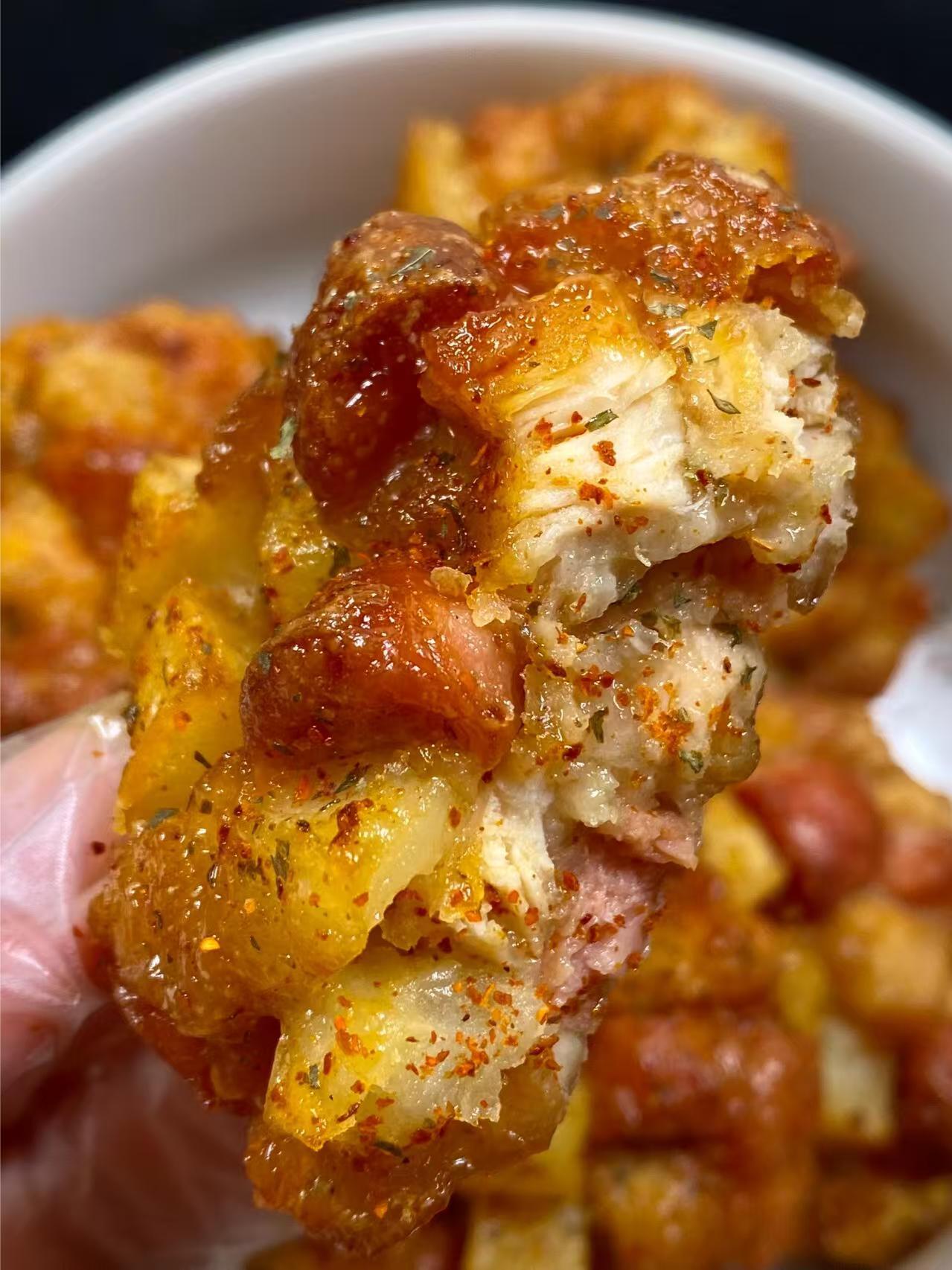 烤到最后几分钟,厨房已经飘满香味了。打开空气炸锅的瞬间,金黄的饼皮泛着油光,边缘微微焦脆,土豆的甜香混着鸡肉的鲜味直往鼻子里钻。拿出来晾30秒,咬一口——外皮酥得掉渣,里面的土豆已经软绵到一抿就化,鸡肉丁鲜嫩多汁,黑胡椒的辛香和生抽的咸鲜完美融合,完全不需要额外蘸酱。如果喜欢重口味,也可以撒点辣椒粉或孜然粉,秒变烧烤味,追剧时抱着盘子吃,比薯片还上瘾。