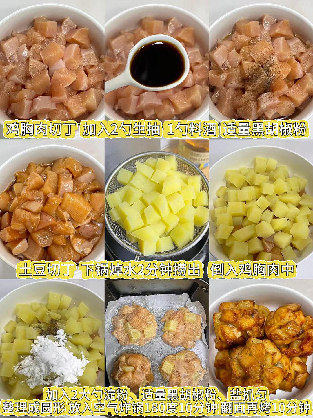 鸡胸肉一块,选那种新鲜的、带着弹性的,冷冻鸡胸肉记得提前解冻并挤干水分。土豆用黄心土豆最好,淀粉含量高,蒸熟后自带甜味,口感更粉糯。处理鸡胸肉:切成1厘米见方的小丁,别切太大否则不好成型,也别太小容易散。装碗后加2勺生抽、1勺料酒、半勺盐和适量黑胡椒粉,用手抓匀,让每块鸡丁都裹上酱汁,腌制15分钟。这个时间刚好够处理土豆,效率拉满。