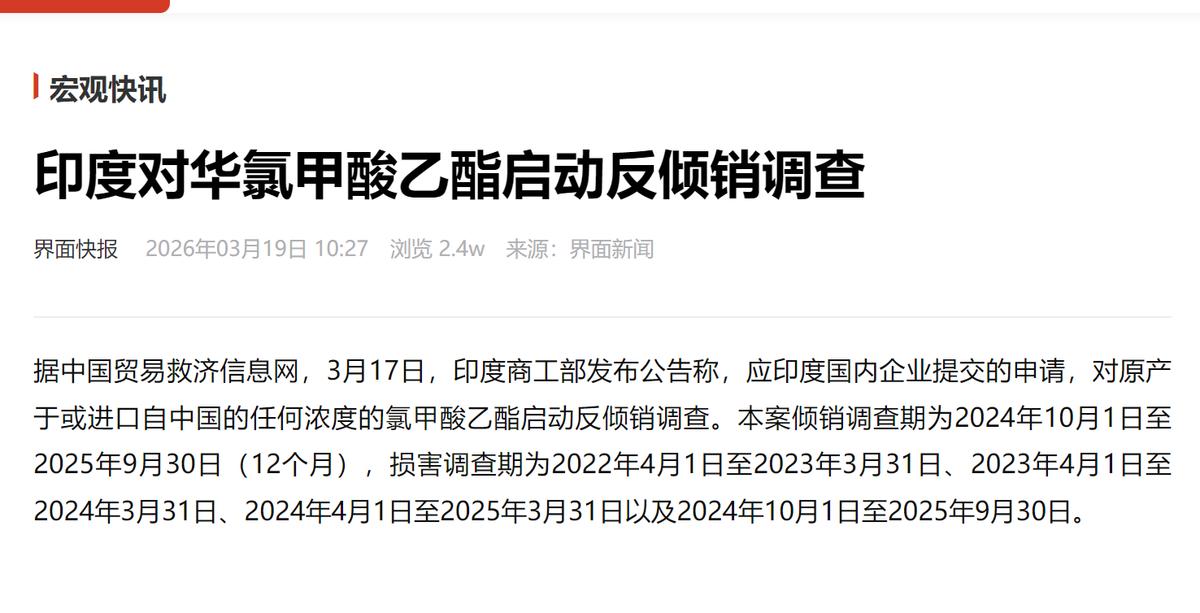 关键是这些都是他们口头承诺,到底怎么进行,谁也不知道。而且他们这调整刚7天,就又整幺蛾子了,3月17日宣布对我们的氯甲酸乙酯进行反倾销调查。