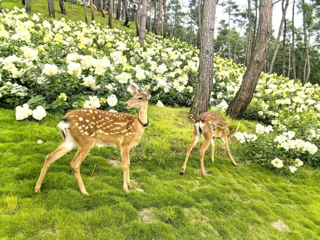 赏花建议:园内饲养着几只可爱的梅花鹿,待到绣球花盛放时节,它们便会在花丛间、小径旁悠闲觅食,憨态可掬的模样十分惹人喜爱,便是你赏花途中的最佳“打卡搭档”。