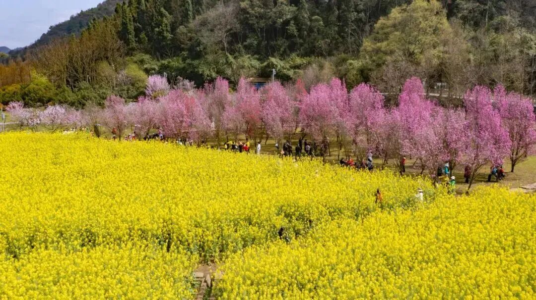 春天的百花湖镇上麦城村千亩樱花进入盛花期,粉白花海连绵起伏,与金黄油菜花田相映成画,日均迎客近万人次,成为贵阳近郊春日顶流打卡地。
