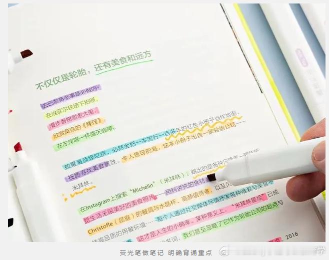 在书本、笔记本中使用荧光笔可以起到标记、提示的作用,根据自己的习惯对于同一重要程度的内容采用同一颜色标记,起到一目了然的作用,但是不宜使用过多颜色,1-3种即可。【图2】