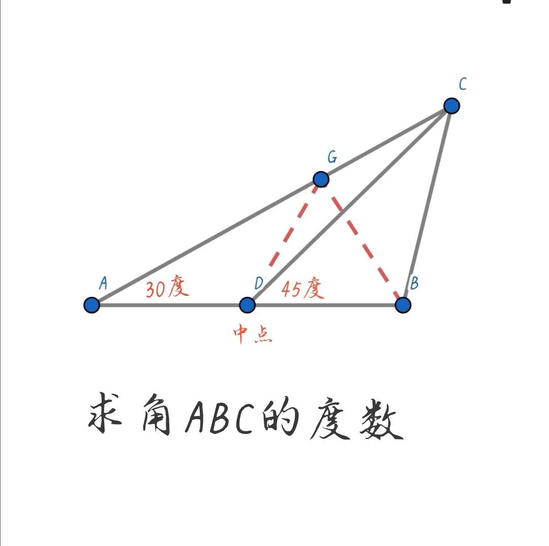遇到特殊角就构造特殊三角形 有30度角和中点,可以构造直角三角形 过点B作AC边的垂线段,垂足为G,连接DG则 DA=DB=DG 所以△ADG为等腰三角形,△BDG为等边三角形,DA=DB=DG=BG,角GBA=60度 角GDC=角GCD=15度,所以△GDC为等腰三角形,GC=GD=GB, 所以△GBC为等腰直角三角形,所以角GBC=45度, 所以角ABC=角GBA+角GBC=60度+45度=105度